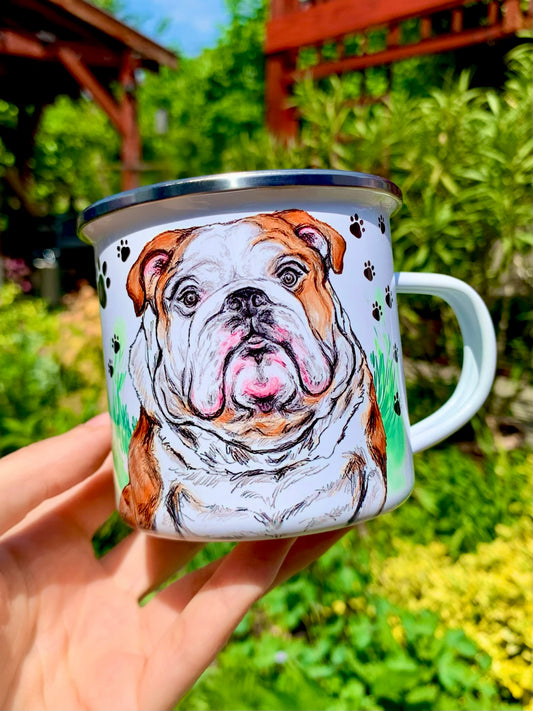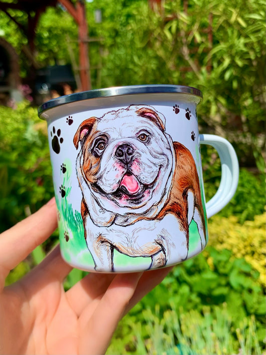 Angol bulldogos fém bögre – Kézzel festett ülő angol bulldog és mancs mintával