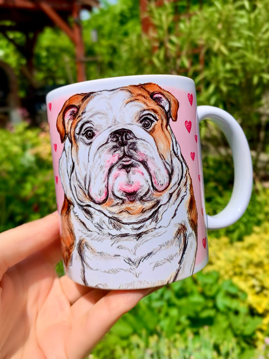 Angol bulldogos kerámia bögre – Kézzel festett Angol bulldog és szív mintával
