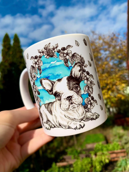 Francia bulldog bögre - álló francia bulldog kutya és kék gyümölcsös mintával