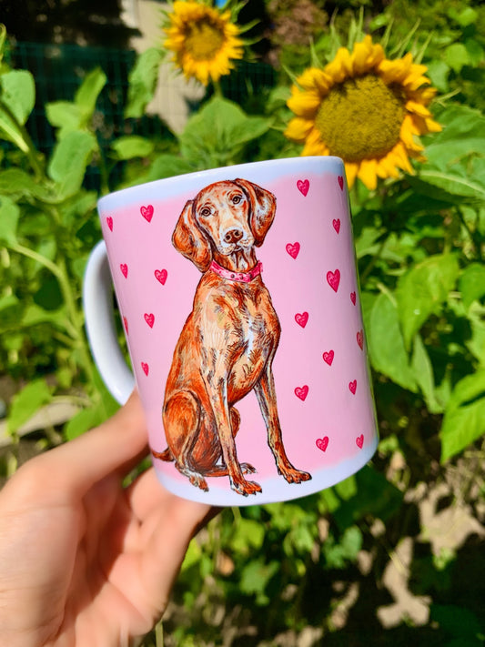 Magyar Vizslás bögre - Kézzel festett Vizsla kutya és rózsaszín szív mintákkal