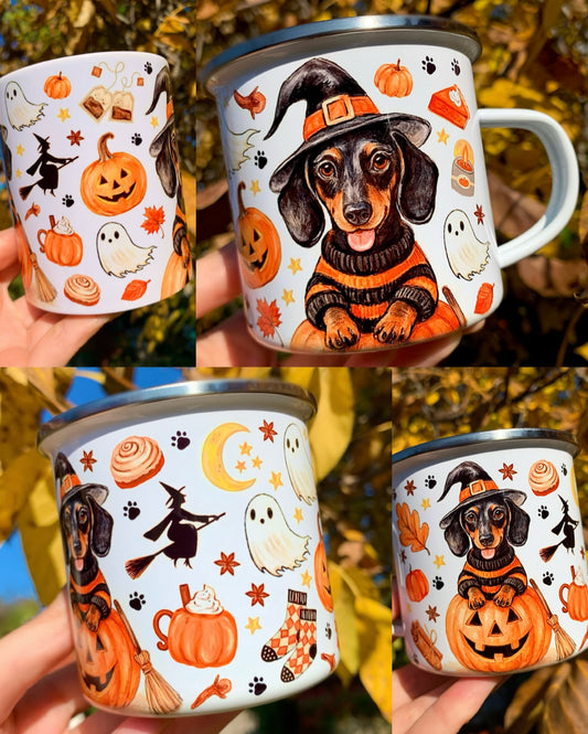 Halloweeni Tacskós fém bögre - Kézzel festett Tacskó Halloweeni Pumpkin és Boszis szellemes őszi mintával