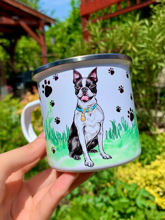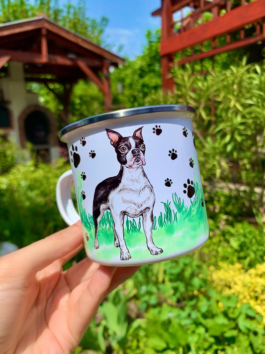 Boston terrieres fém bögre – Kézzel festett ülő Boston és mancs mintával