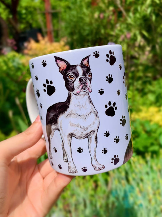 Boston terrieres kerámia bögre – Kézzel festett álló Boston és mancsos mintákkal
