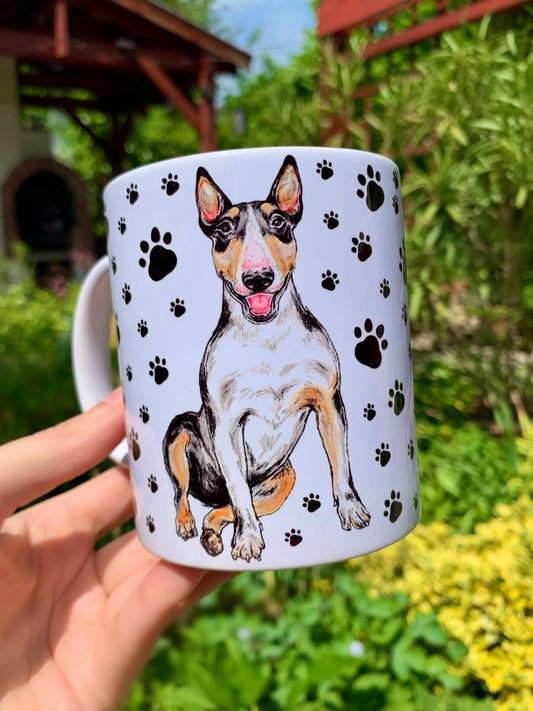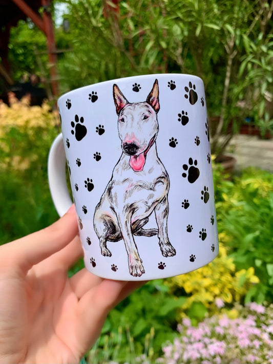 Bullterrier kerámia bögre – Kézzel festett világos Bullterrier kutya és mancsos mintákkal