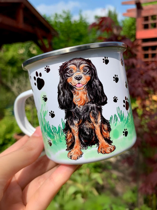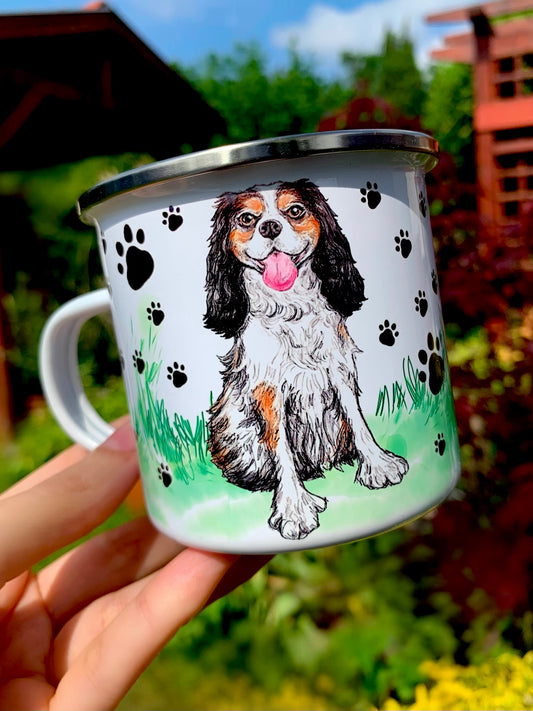 Cavalier Spániel fém bögre - Kézzel festett Cavi kutya és Mancsos háttér mintával