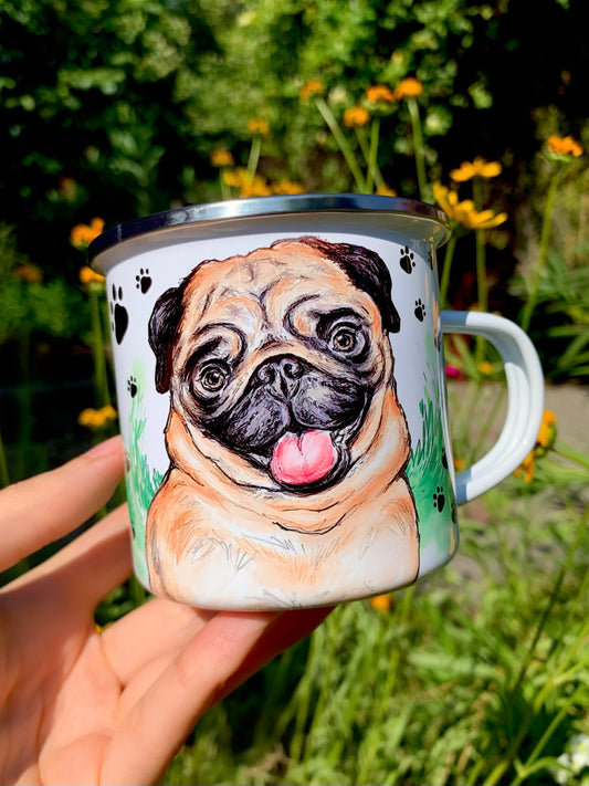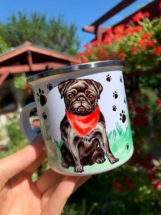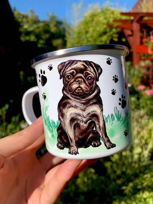 Mopszos Fém bögre – Kézzel festett ülő Mopsz kutya mancs és fű mintával