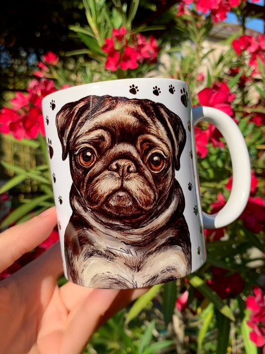 Mopsz kutyás Kerámia bögre – Kézzel festett Fekete Mopsz mintával és mancsokkal