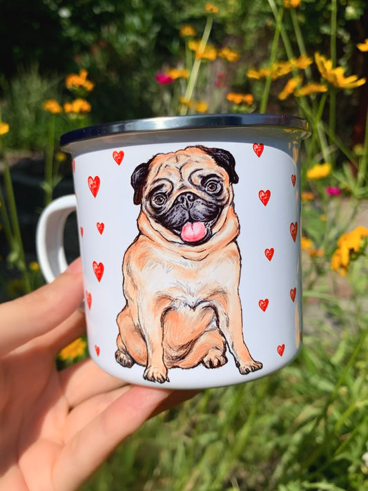 Mopszos Fém bögre – Kézzel festett barna Mopsz és szív mintákkal