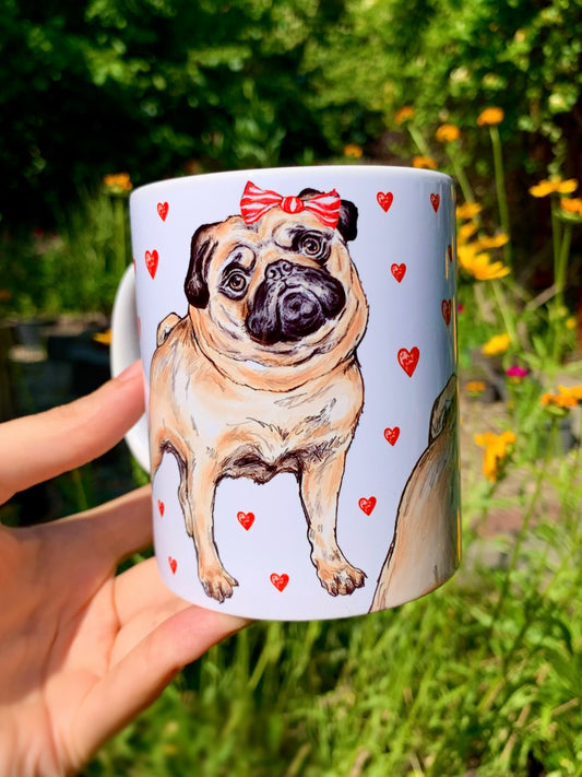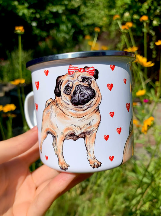 Mopsz kutyus Fém bögre – Kézzel festett álló Mopsz masnival és szív mintákkal