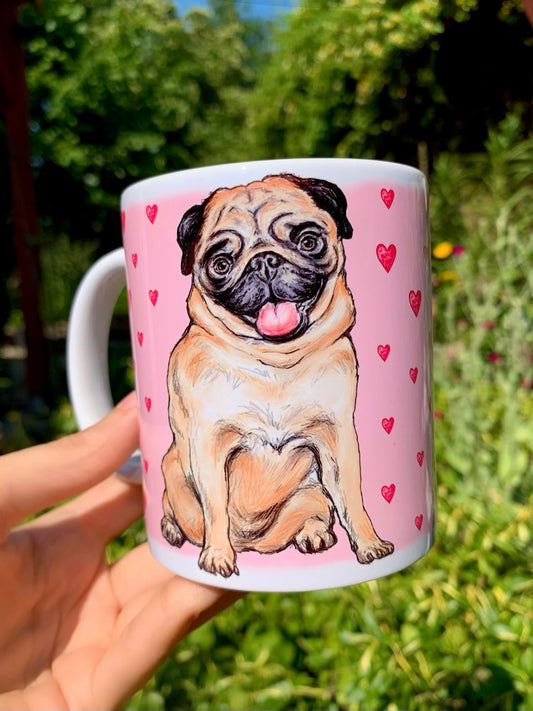 Mopszos Kerámia bögre – Kézzel festett barna Mopsz és rózsaszín szív mintákkal