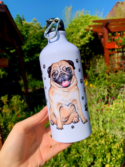 Mopszos kulacs – Kézzel festett ülő Mopsz kutya és mancs mintával