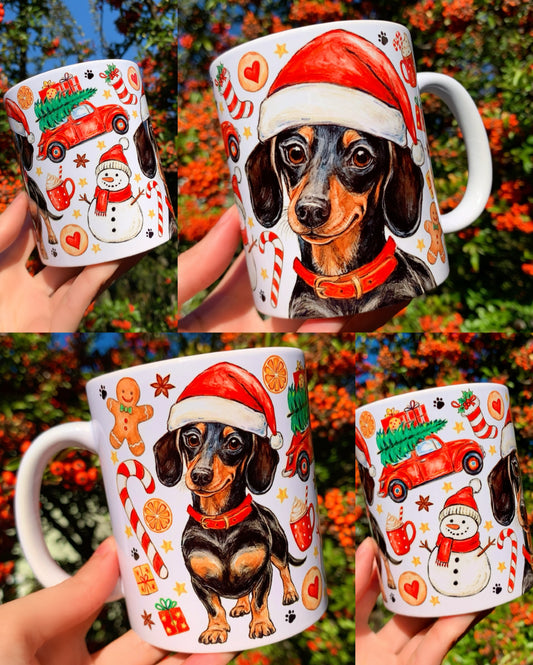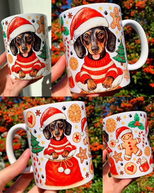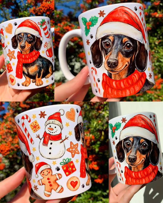 Karácsonyi Tacskós bögre - Kézzel festett Tacskó Mikulás zsákkal és karácsonyi mintával
