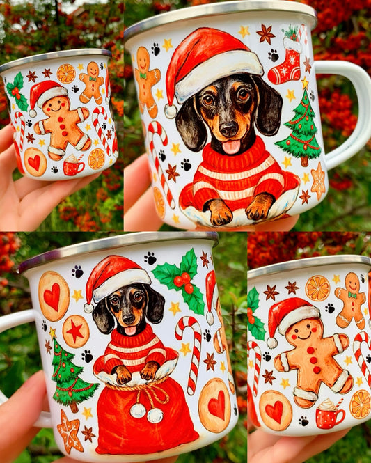 Karácsonyi Tacskós fém bögre - Kézzel festett Tacskó Mikulás zsák mintával