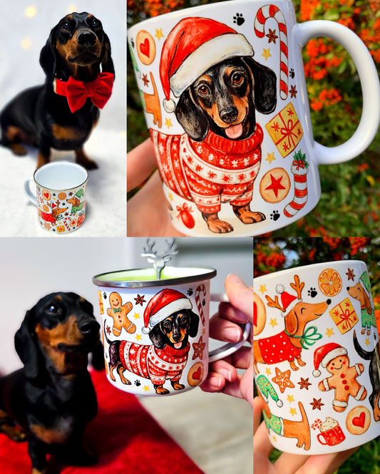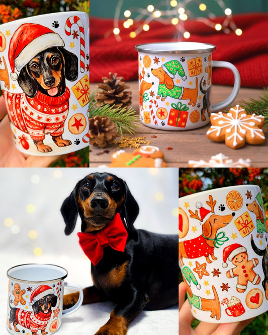 Karácsonyi Tacskós fém bögre - Kézzel festett Tacskó karácsonyi pulcsis mintával