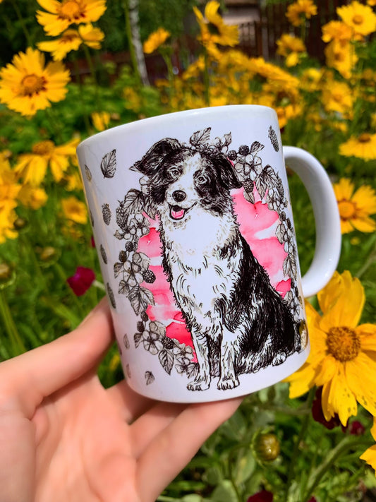 Border collie kutya bögre - ülő Border Collie és Rózsaszín gyümölcsös háttérrel