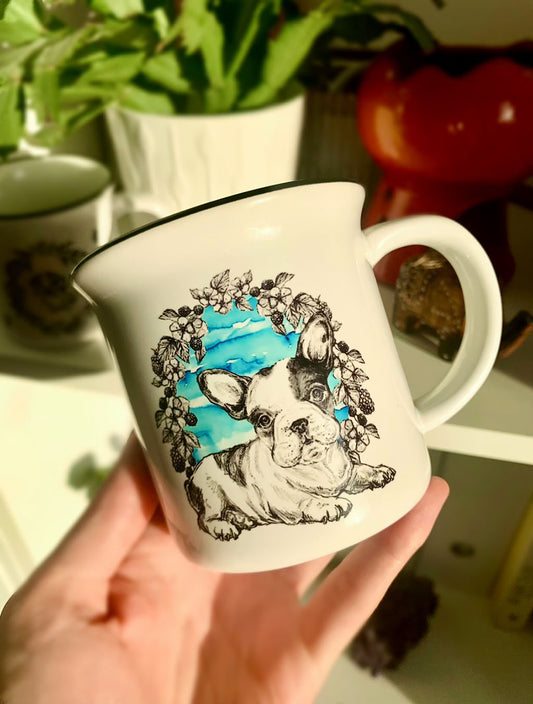 Boston terrier kerámia bögre – Kézzel festett ülő Boston terrier kutyával és KÉK NYAKÖRVVEL