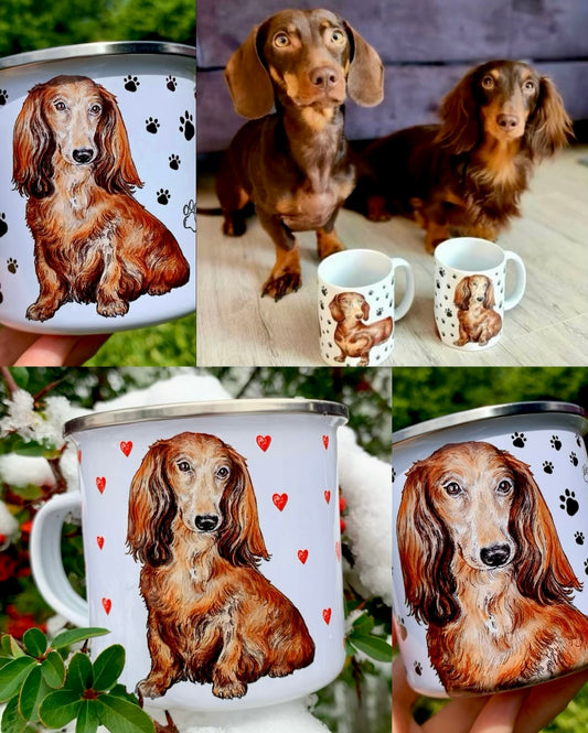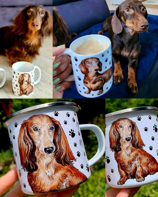 Hosszúszőrű Tacskós fém bögre - Kézzel festett Hosszúszőrű tacsi és Mancs mintákkal - Egyedi név kérhető rá