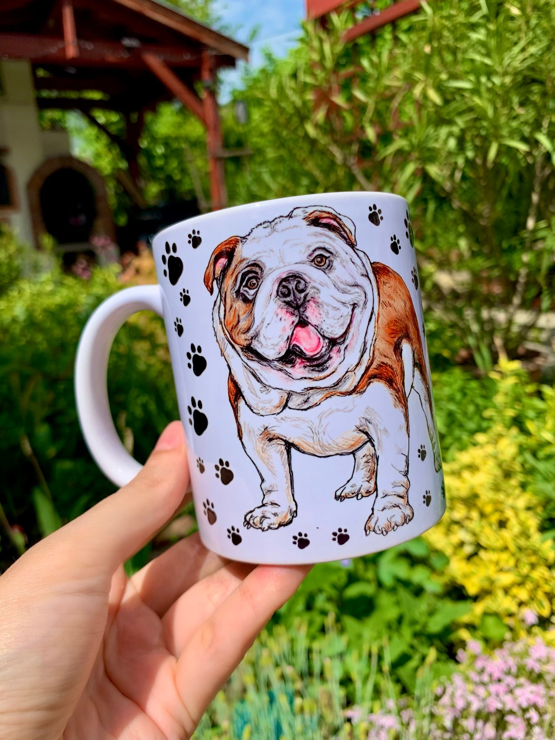 A bögre egyedi, kézzel rajzolt és festett bulldogos mintájával minden kávézást és teázást különlegessé varázsol.