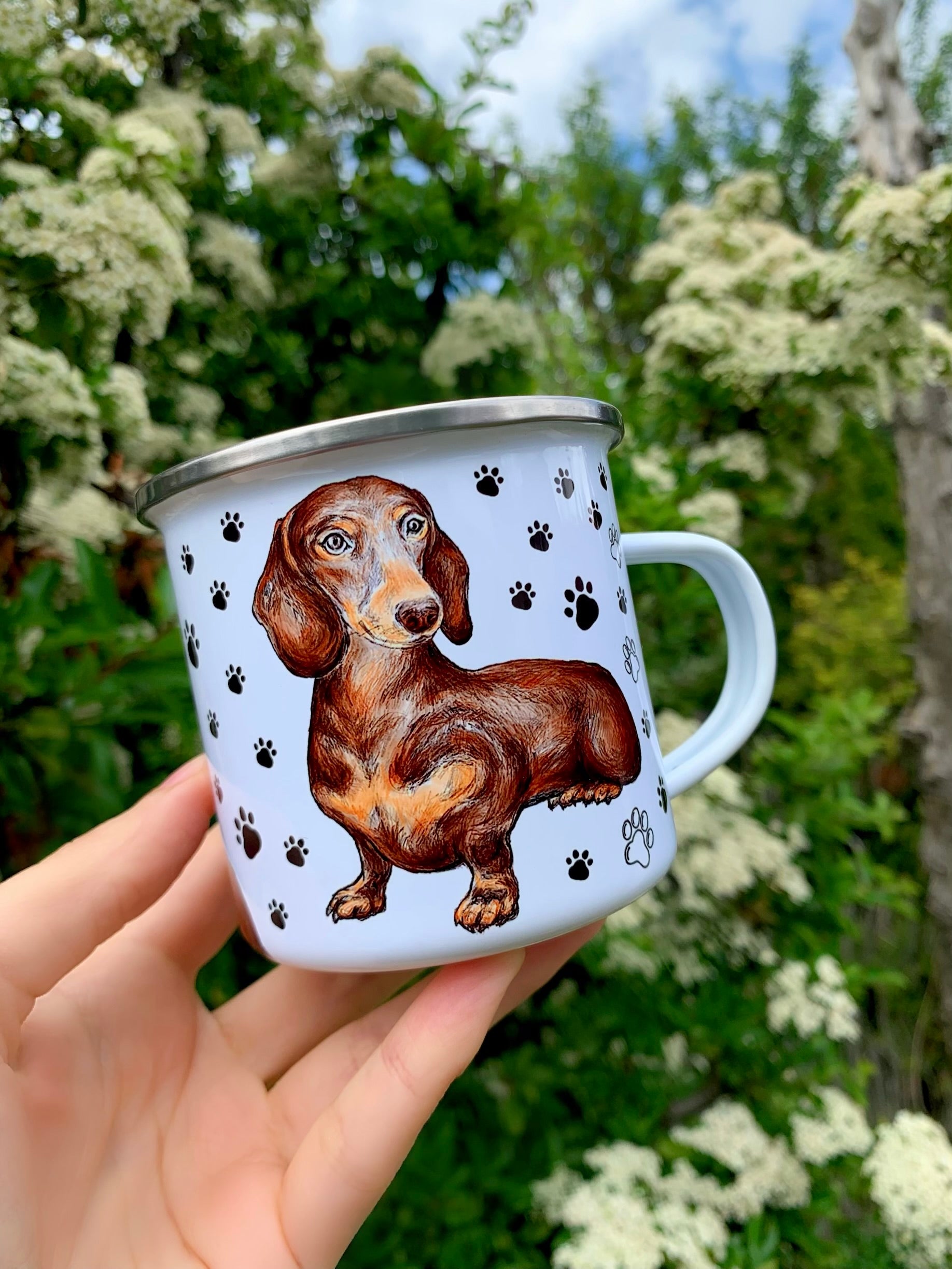 🐶 Ismerd meg legújabb kutyás kedvencünket: itt a kézzel rajzolt tacskós fém bögre – azoknak, akik imádják ezt a játékos, hűséges és vidám kutyafajtát!