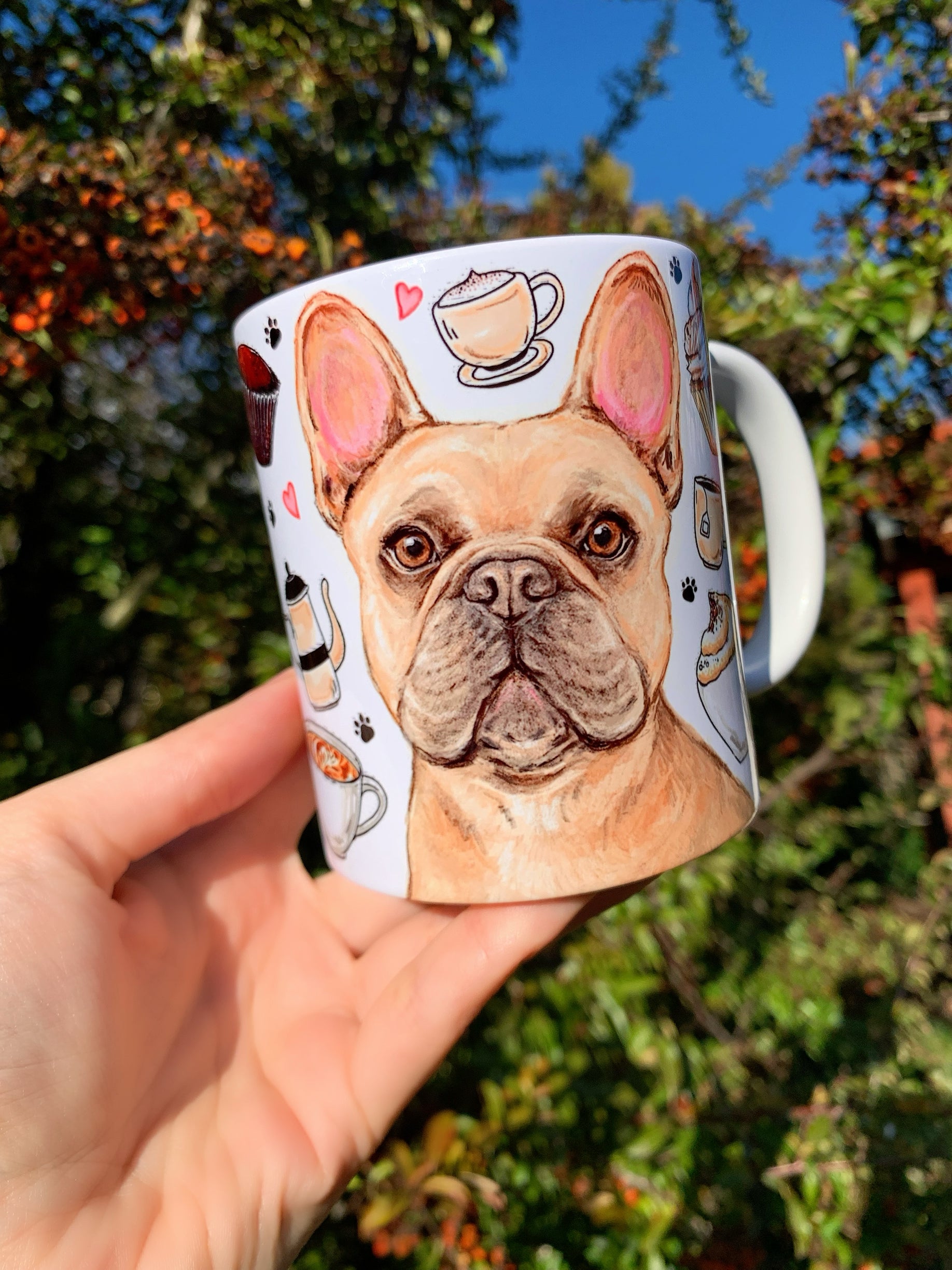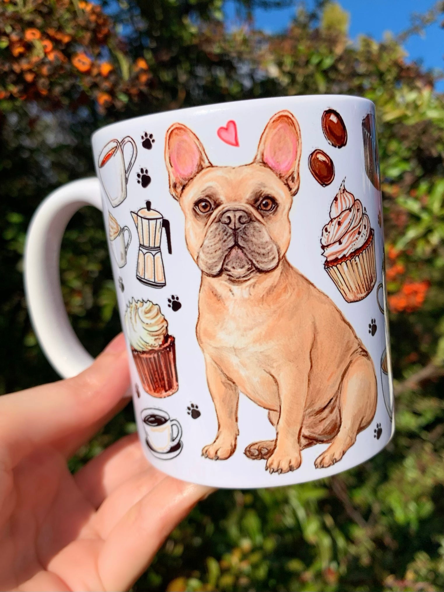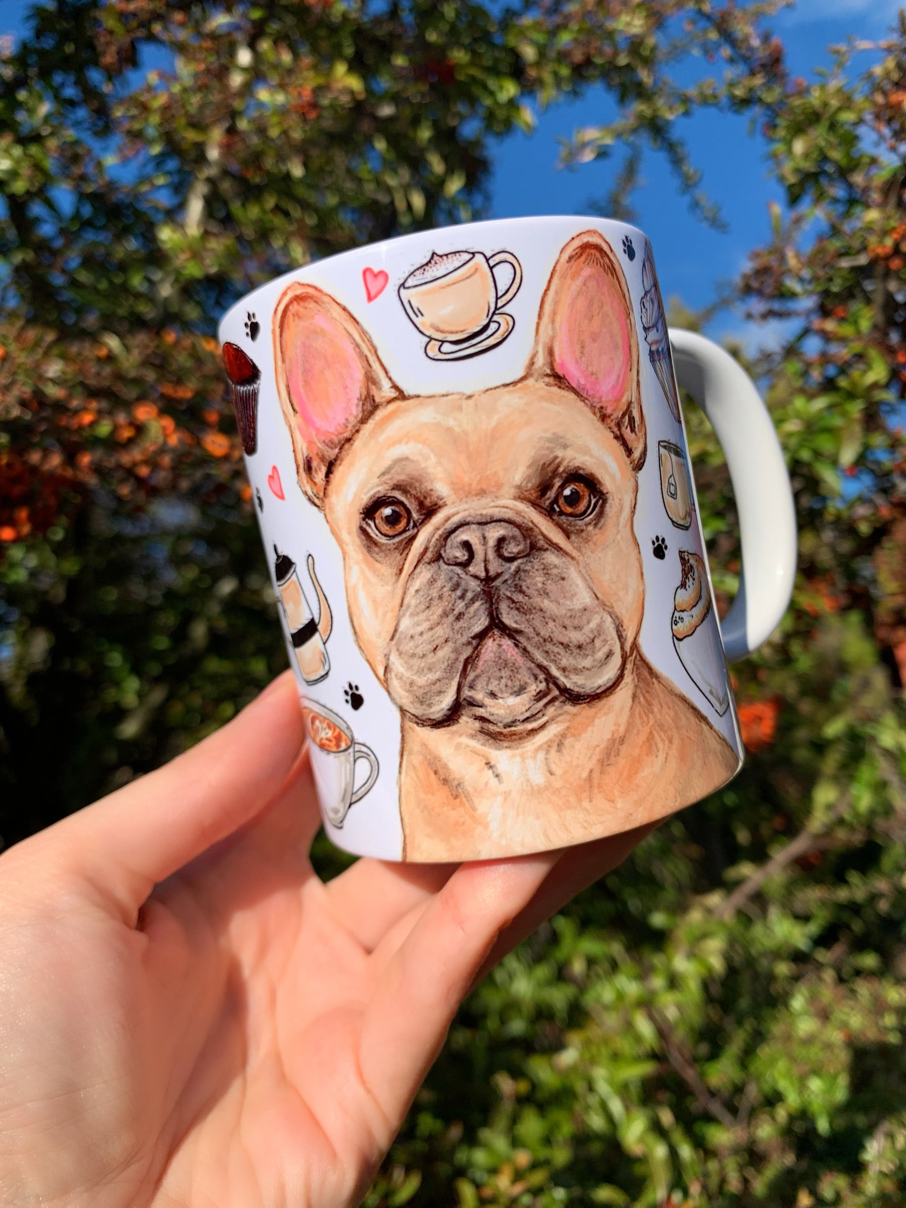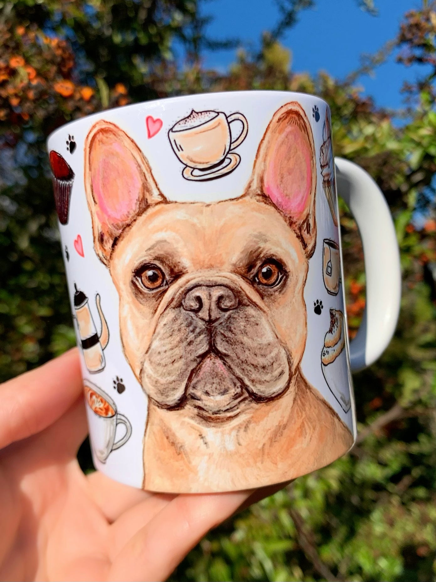 A bögre egyedi, kézzel rajzolt és festett francia bulldog mintájával minden kávézást és teázást különlegessé varázsol.