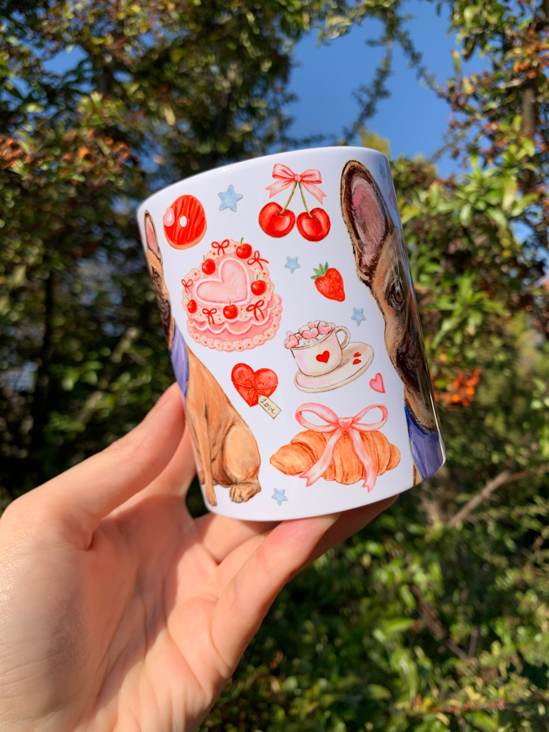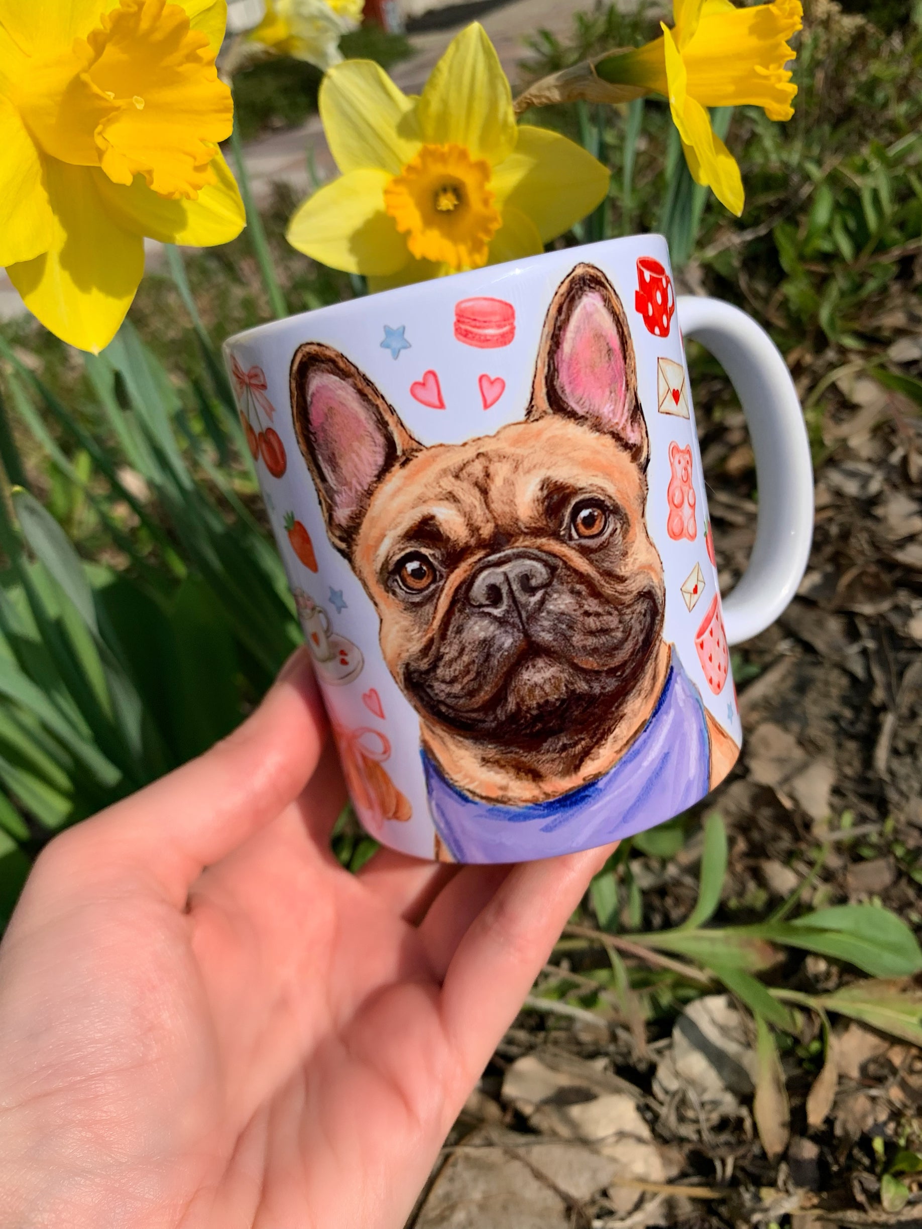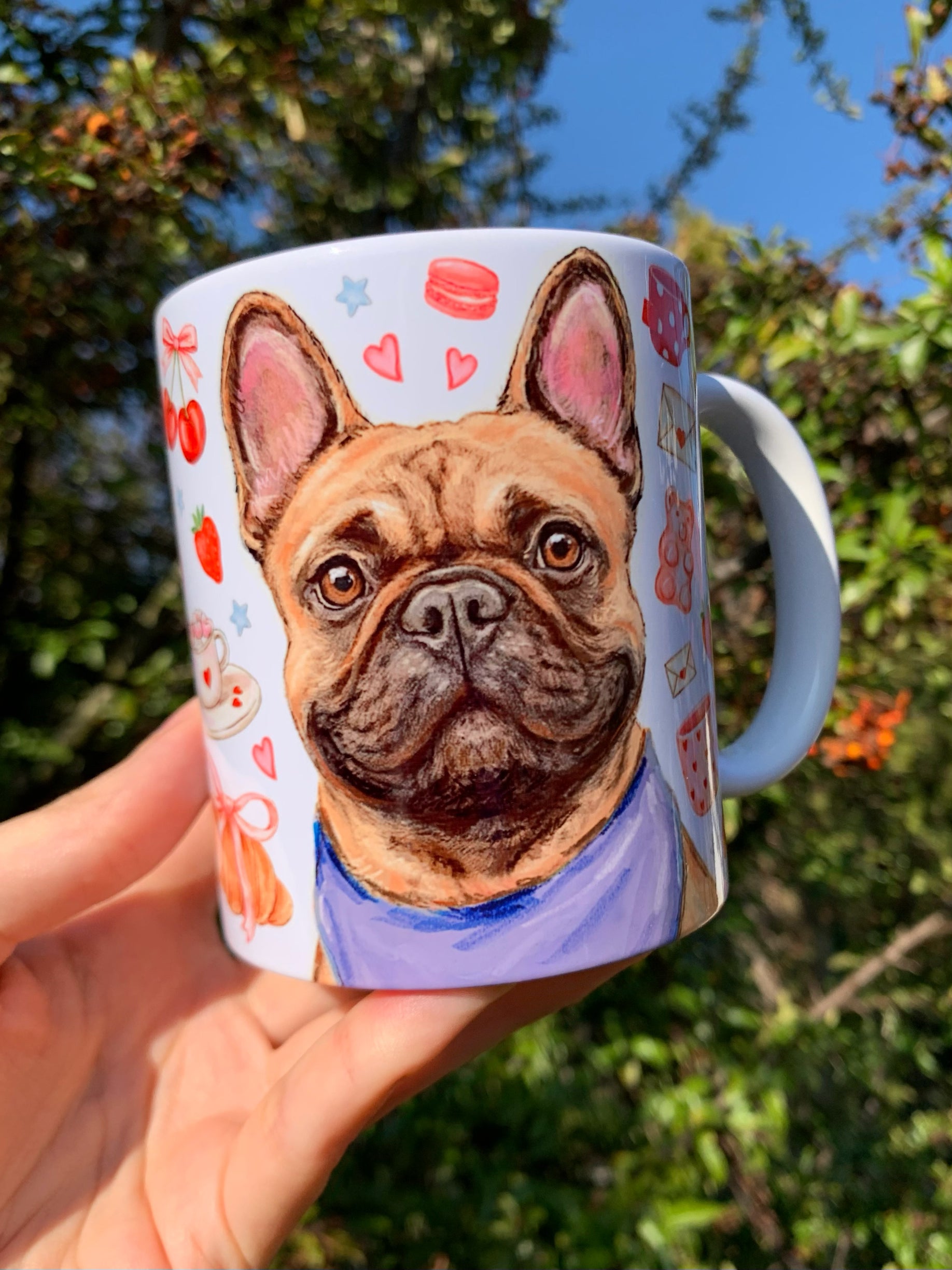 A bögre egyedi, kézzel rajzolt és festett francia bulldog mintájával minden kávézást és teázást különlegessé varázsol.