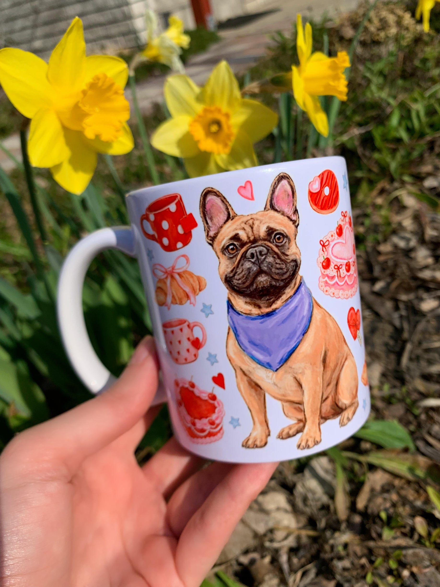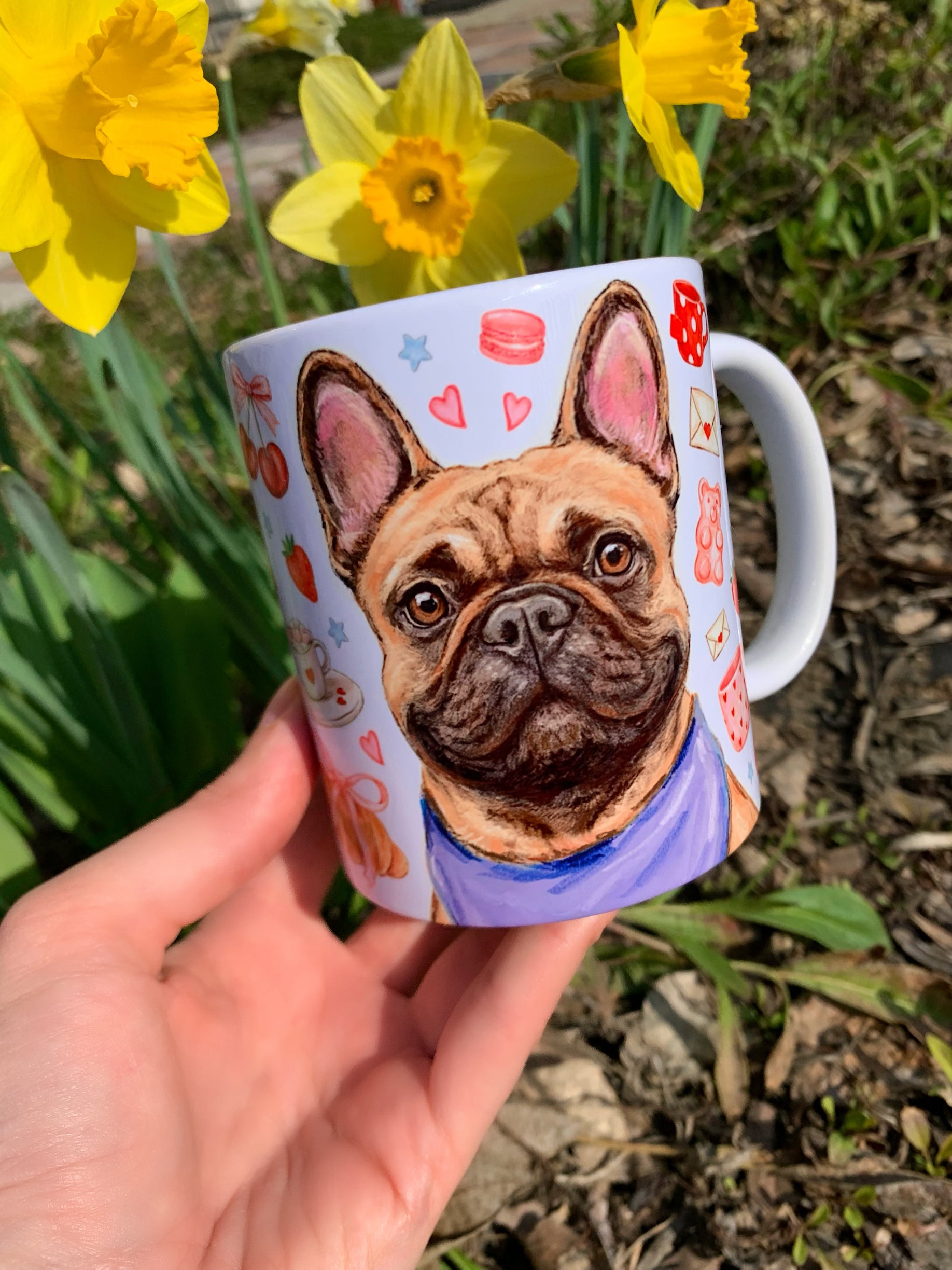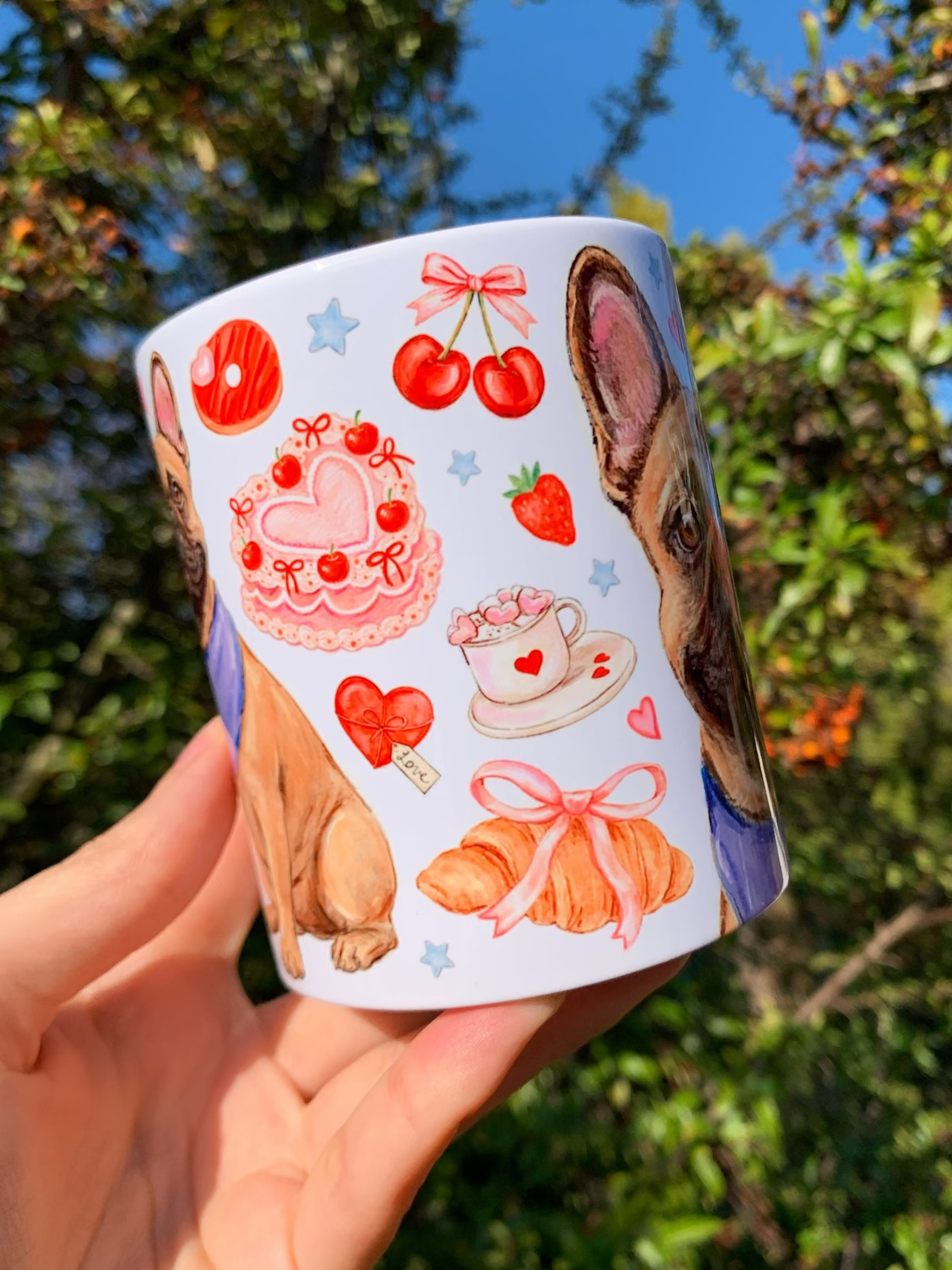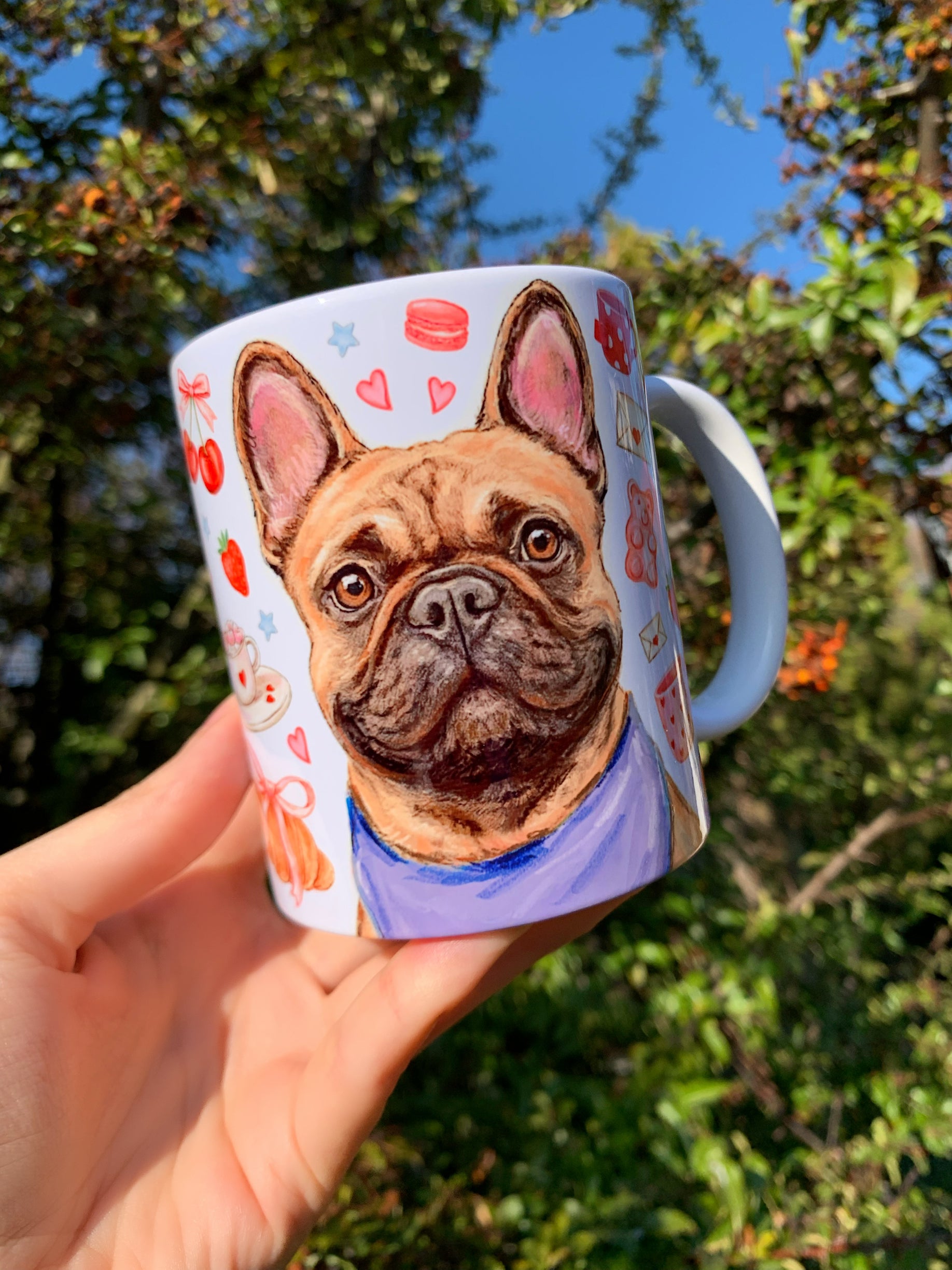 A bögre egyedi, kézzel rajzolt és festett francia bulldog mintájával minden kávézást és teázást különlegessé varázsol.