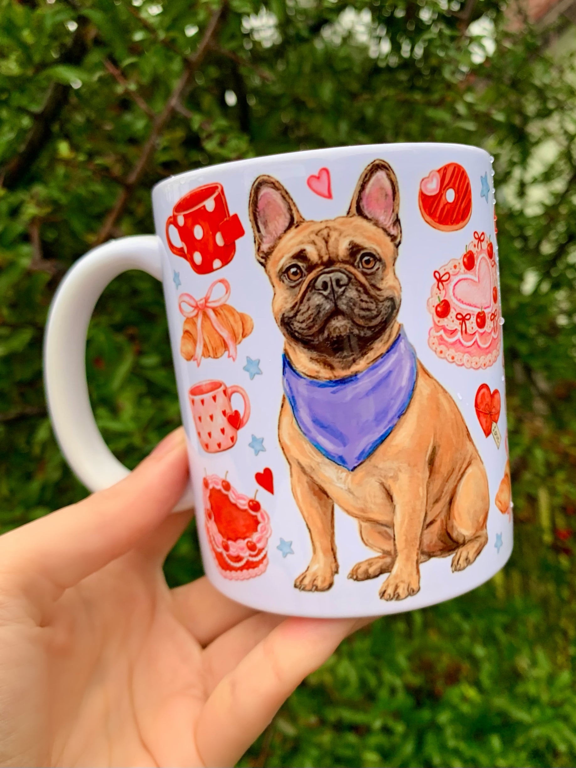 Francia bulldogos bögre - Kézzel festett Francia bulldog mintával és süteményes mintákkal
