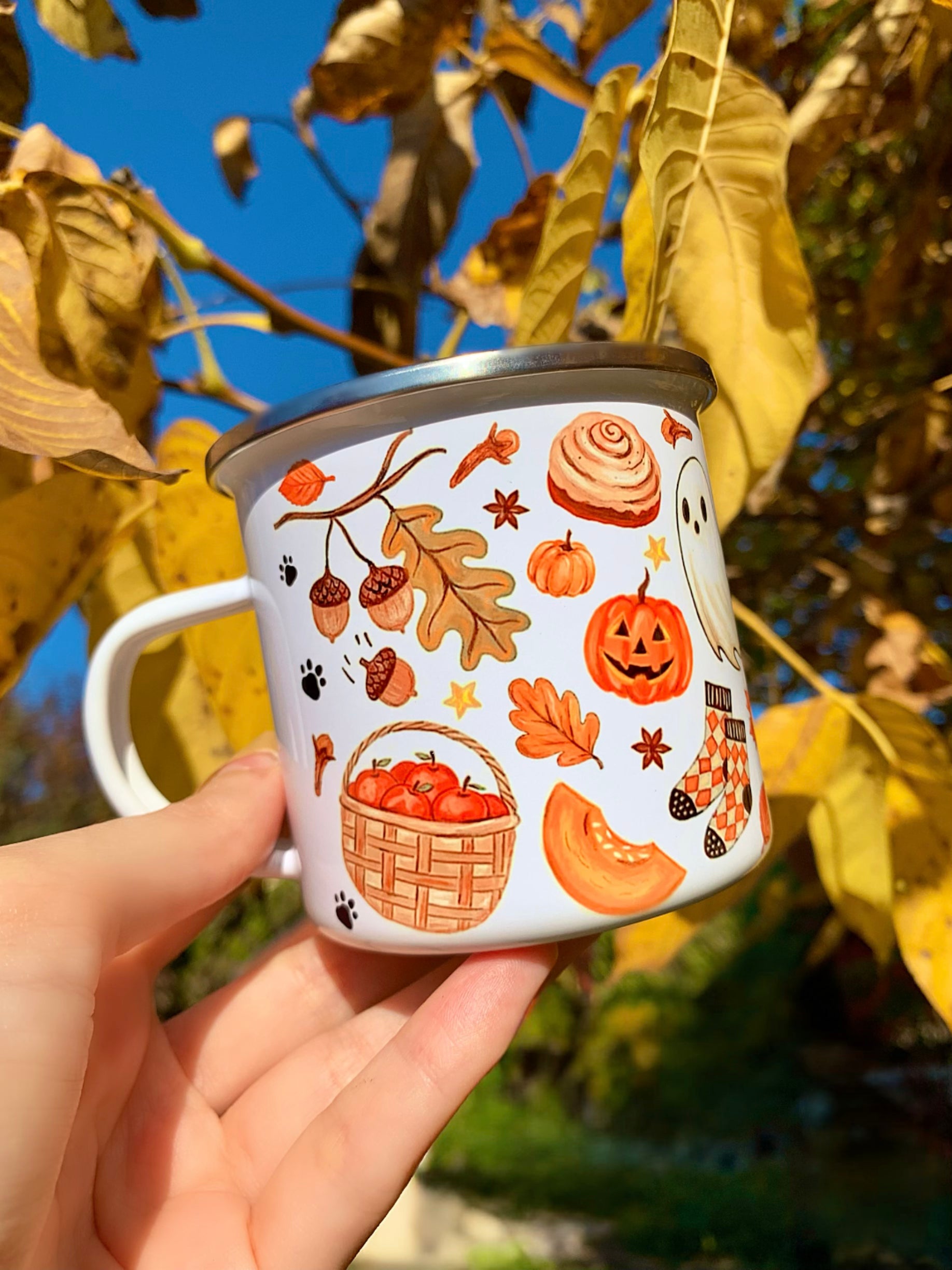 Különleges Halloweeni Tacskós fém bögrénket egy nagyon kedves kézzel festett cser színű tacskó illusztráció díszíti, aki boszorkánykalapot visel, és vidáman figyel a körülötte lebegő szellemes és tökös őszi motívumok között. A mintát pumpkin pie szeletek, pumpkin spice latte, sütőtök, fahéjas csiga, levelek és boszorkányos elemek egészítik ki, hogy igazi halloweeni hangulatot varázsoljanak minden kávézáshoz vagy teázáshoz. A kézzel rajzolt, akvarelles stílusú grafikák meleg, őszi árnyalatokban készültek, a bögre fémes fényén pedig még jobban életre kelnek a részletek. Ez a prémium, iparművészeti minőségű tacskós bögre nemcsak gyönyörű, hanem strapabíró is — tökéletes társ őszi sétákhoz, kirándulásokhoz és kutyás kalandokhoz. 🎃🐾