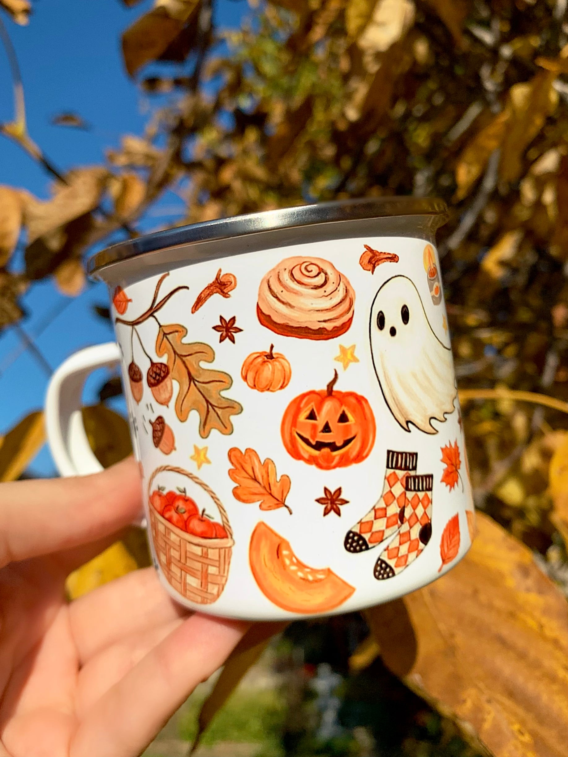 Halloweeni Tacskós fém bögre - Kézzel festett Tacskó Halloweeni Szellem és Pumpkin őszi mintával