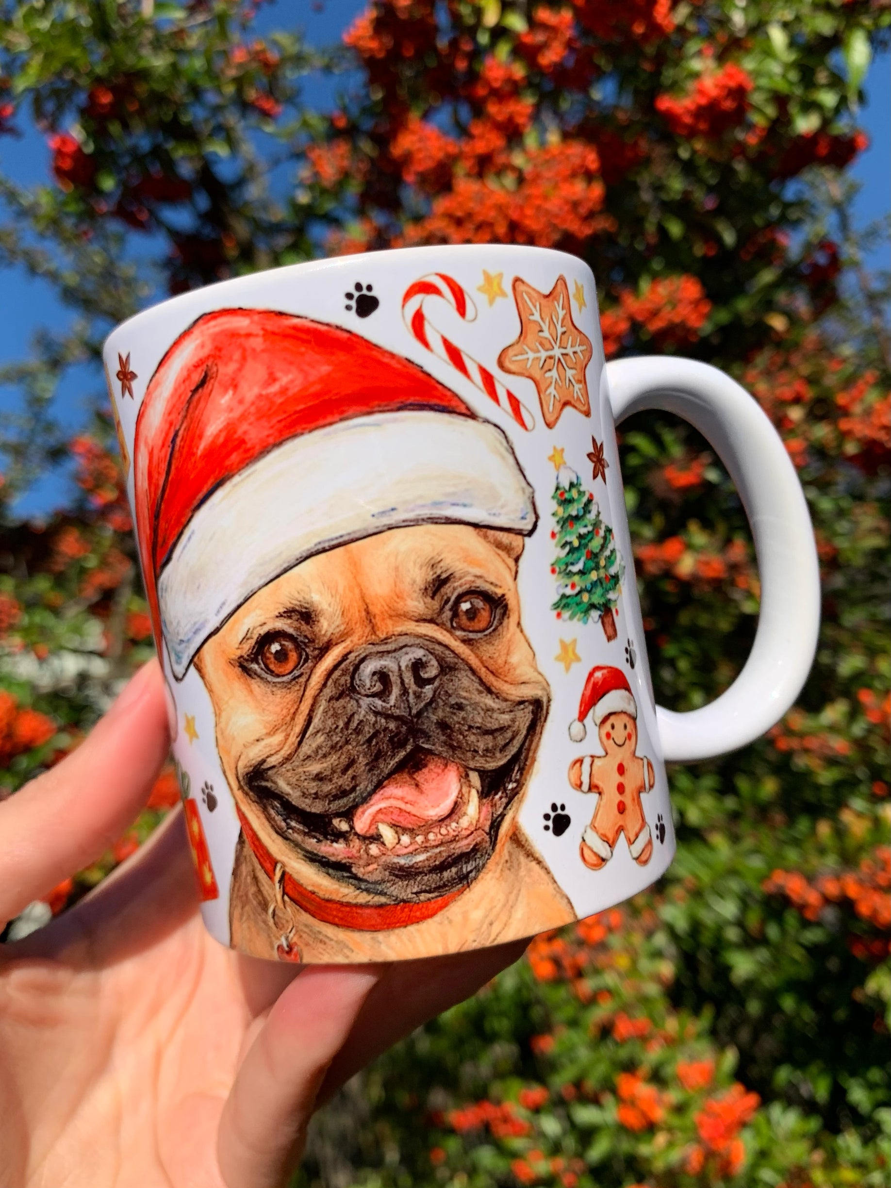 A bögre egyedi, karácsonyi és kézzel rajzolt és festett francia bulldog mintájával minden kávézást és teázást ünnepi hangulatúvá tesz.