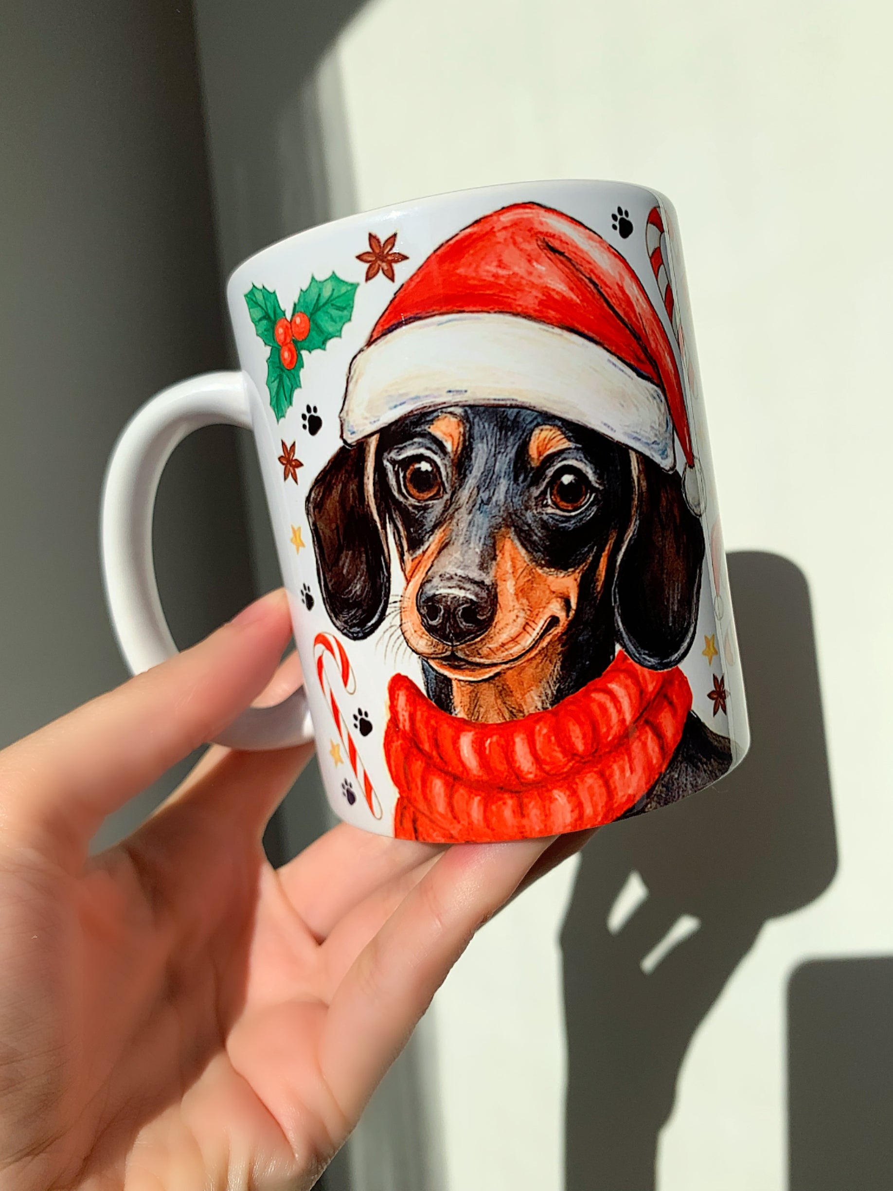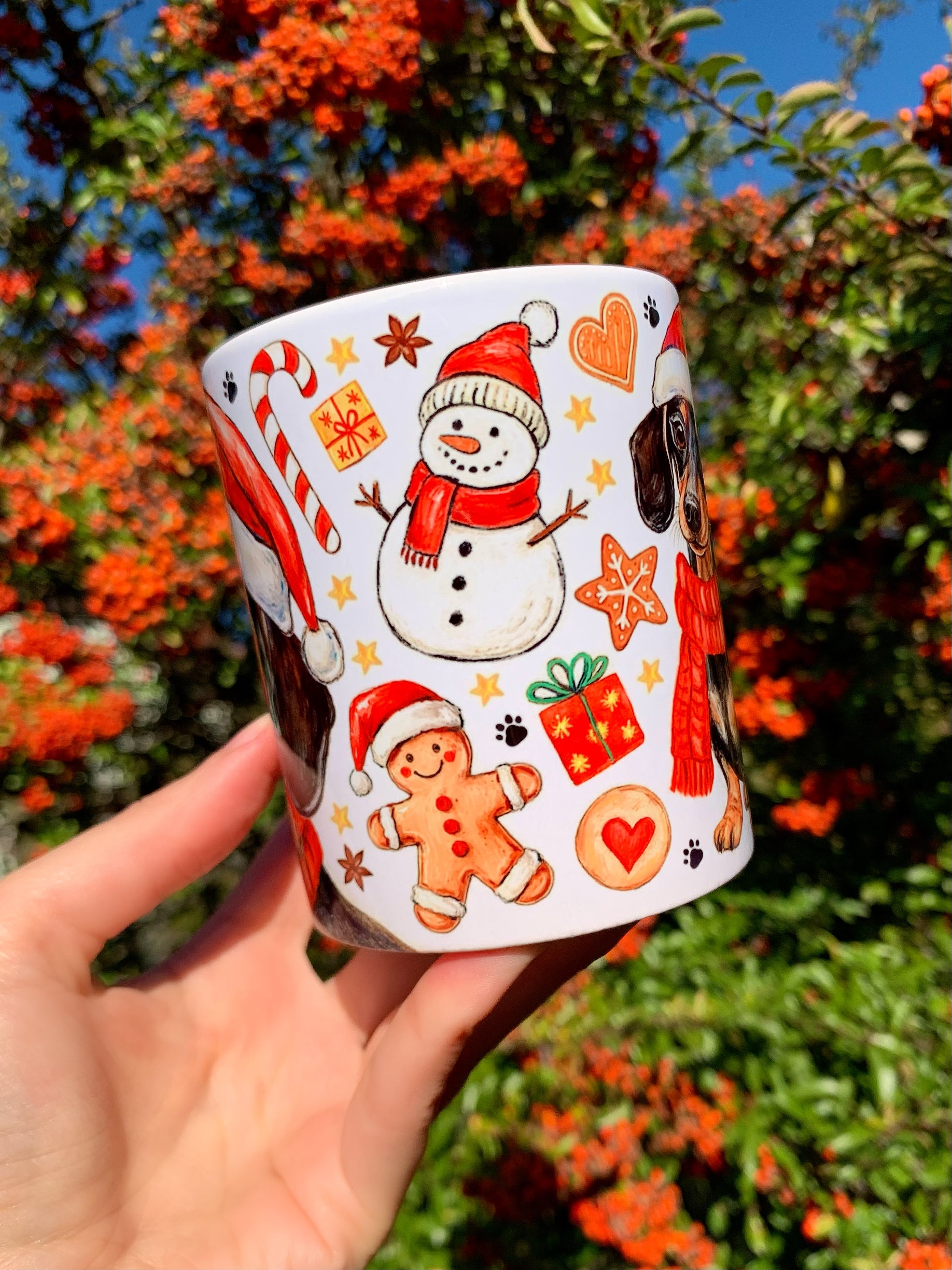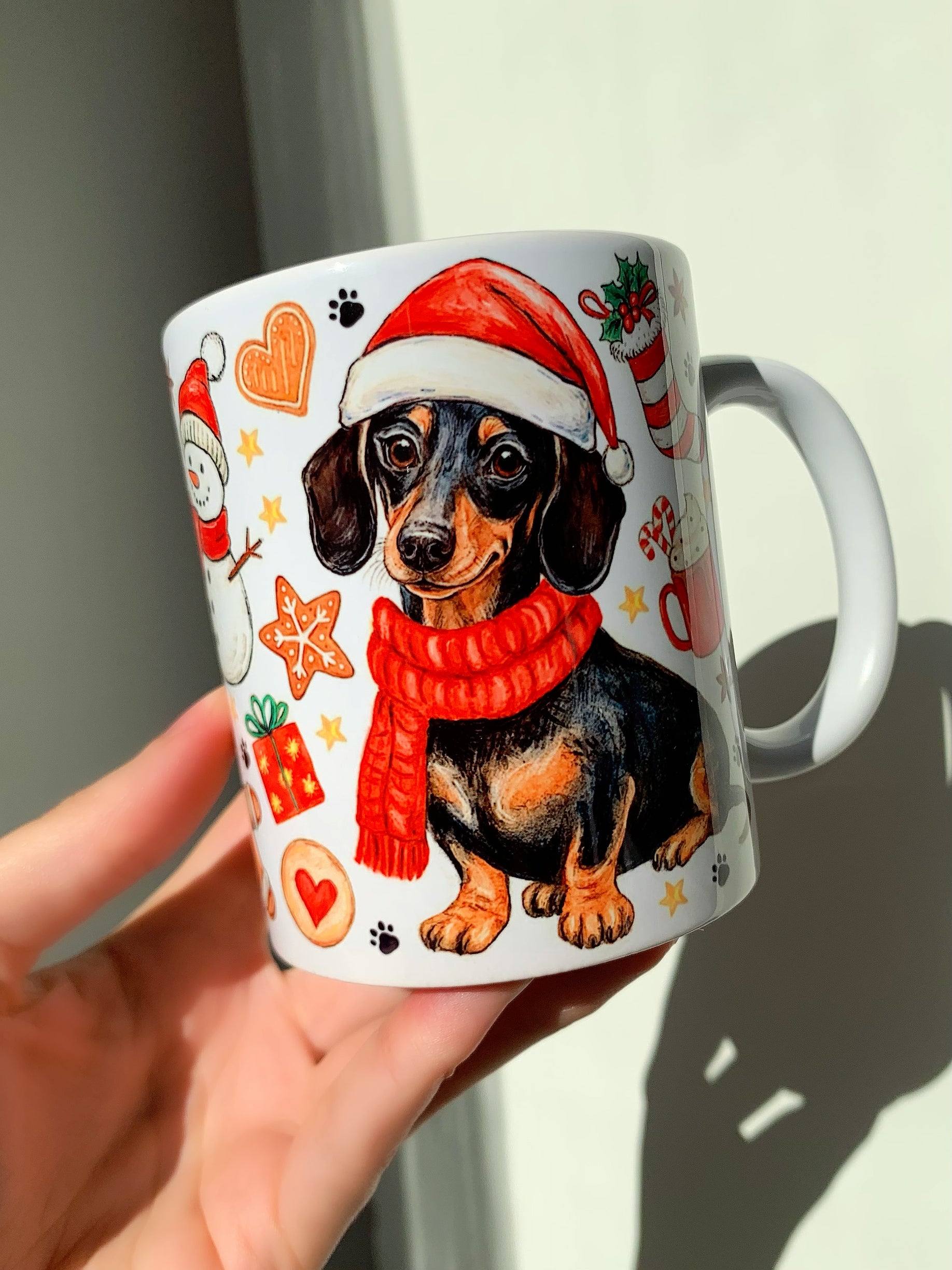 A tacskót apró, kézzel rajzolt karácsonyi motívumok veszik körül, amelyek tovább erősítik az ünnepi hangulatot: mézeskalács figurák, piros–fehér karácsonyi cukorkák, kedves kis harangok, karácsonyi növények, valamint édes ünnepi sütemények és piros–zöld dekor elemek díszítik a bögrét. Ezek a részletek mind gondosan megrajzolt, akvarelles textúrákkal készültek, hogy a bögre teljes felülete harmonikus és szerethető legyen.