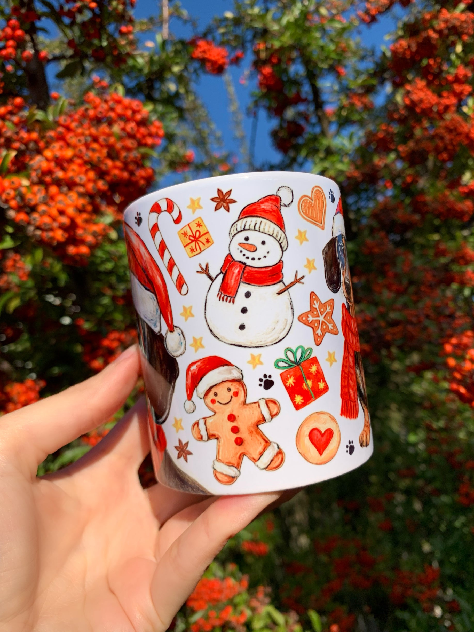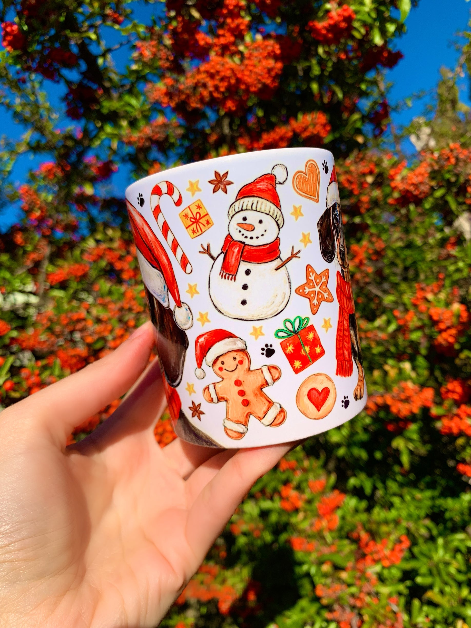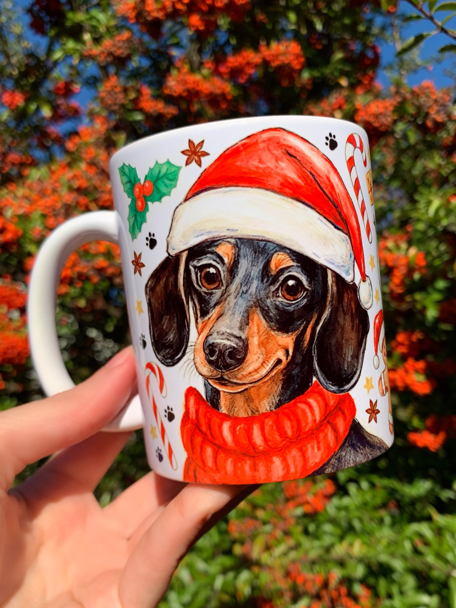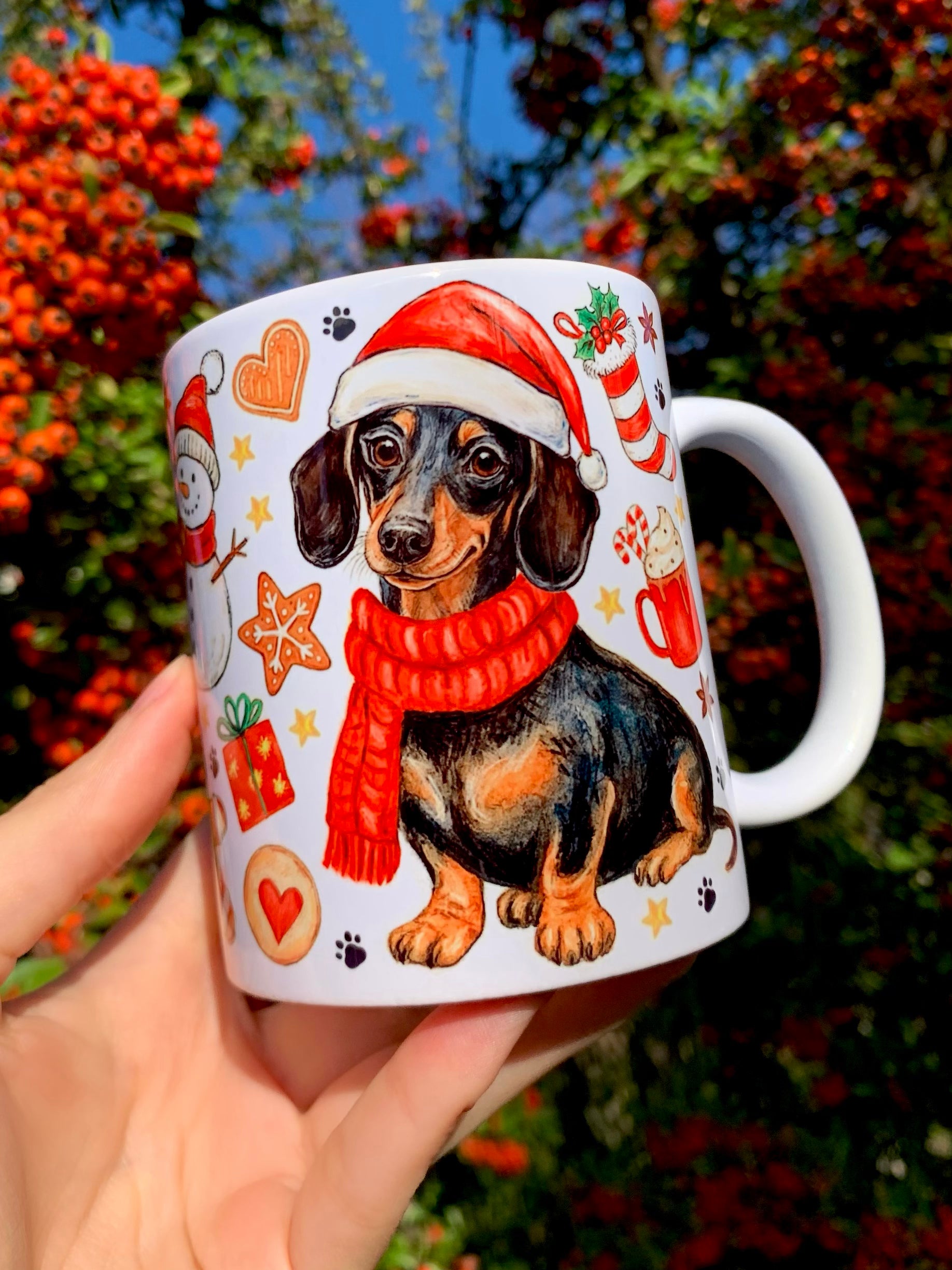 A tacskót apró, kézzel rajzolt karácsonyi motívumok veszik körül, amelyek tovább erősítik az ünnepi hangulatot: mézeskalács figurák, piros–fehér karácsonyi cukorkák, kedves kis harangok, karácsonyi növények, valamint édes ünnepi sütemények és piros–zöld dekor elemek díszítik a bögrét. Ezek a részletek mind gondosan megrajzolt, akvarelles textúrákkal készültek, hogy a bögre teljes felülete harmonikus és szerethető legyen.