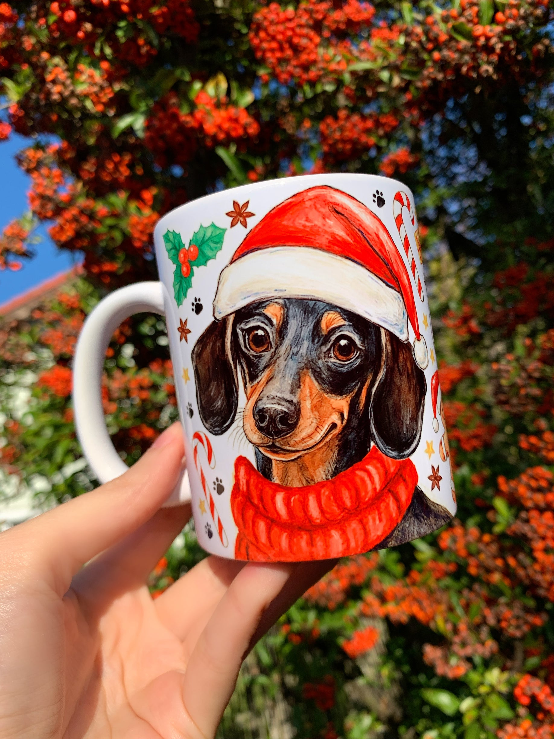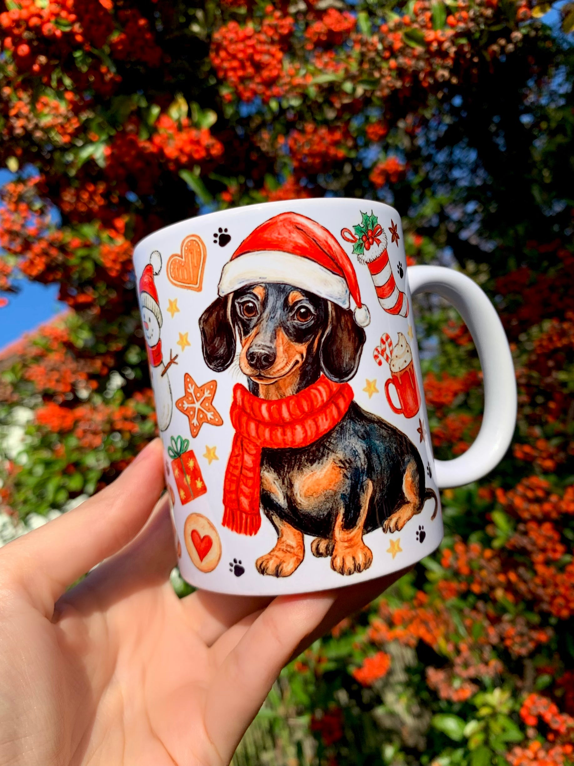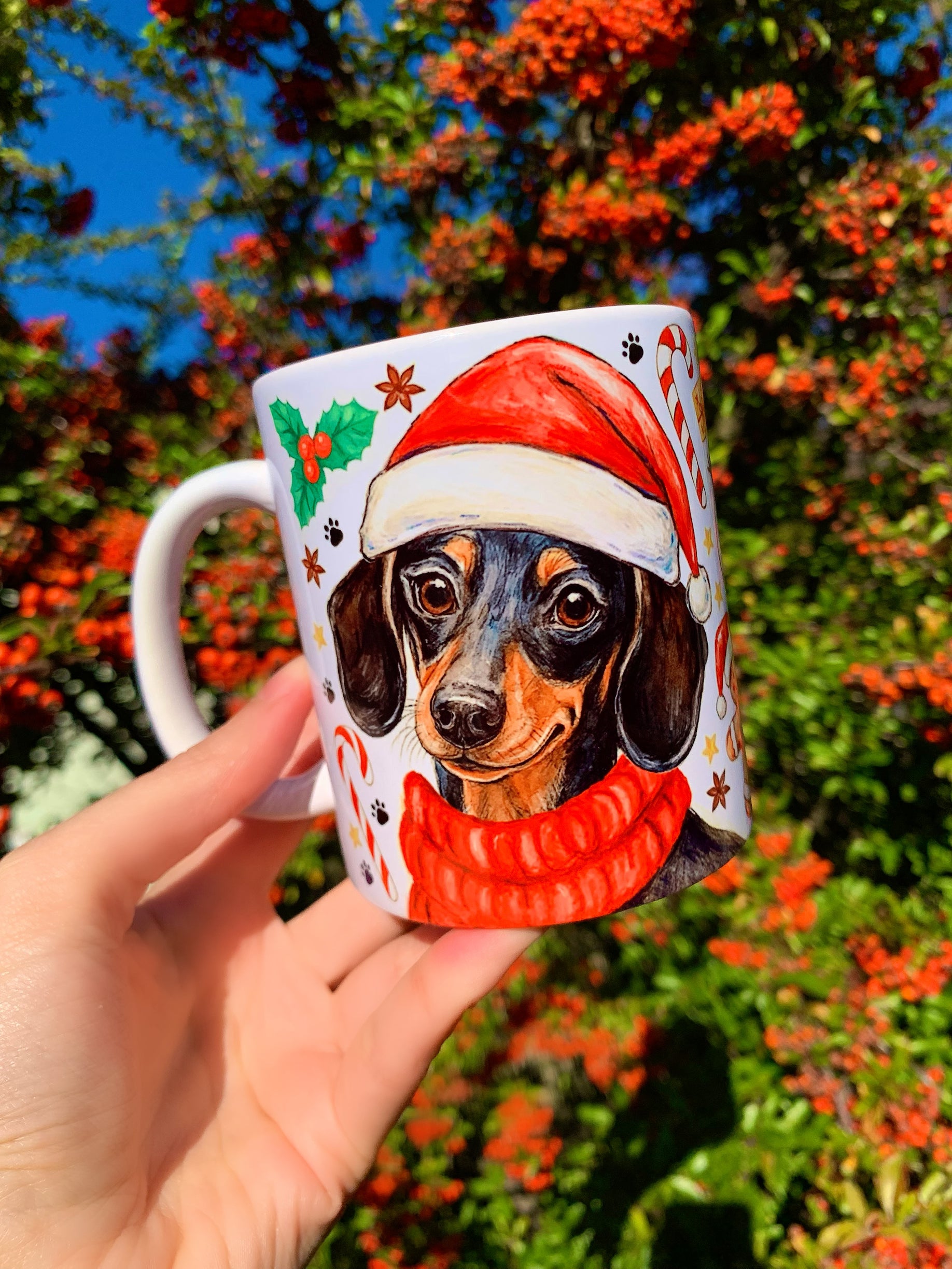 Karácsonyi Tacskós bögre - Kézzel festett Tacskó Mikulás sapkás és sálas karácsonyi mintával