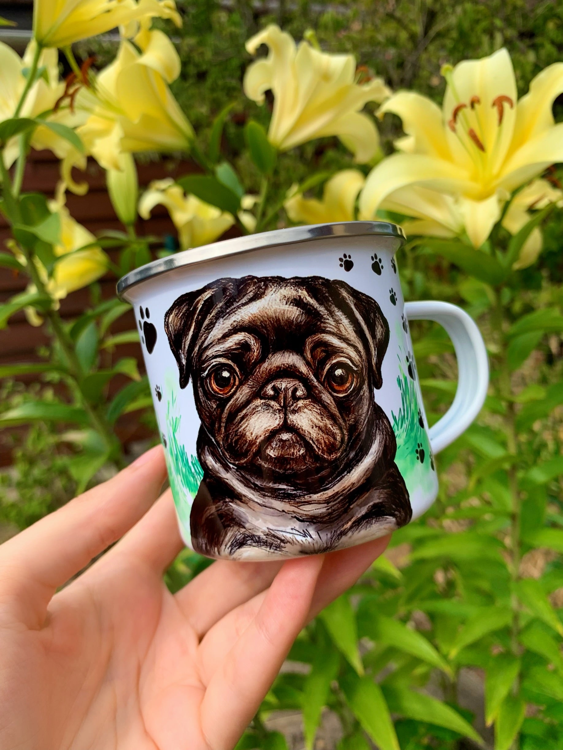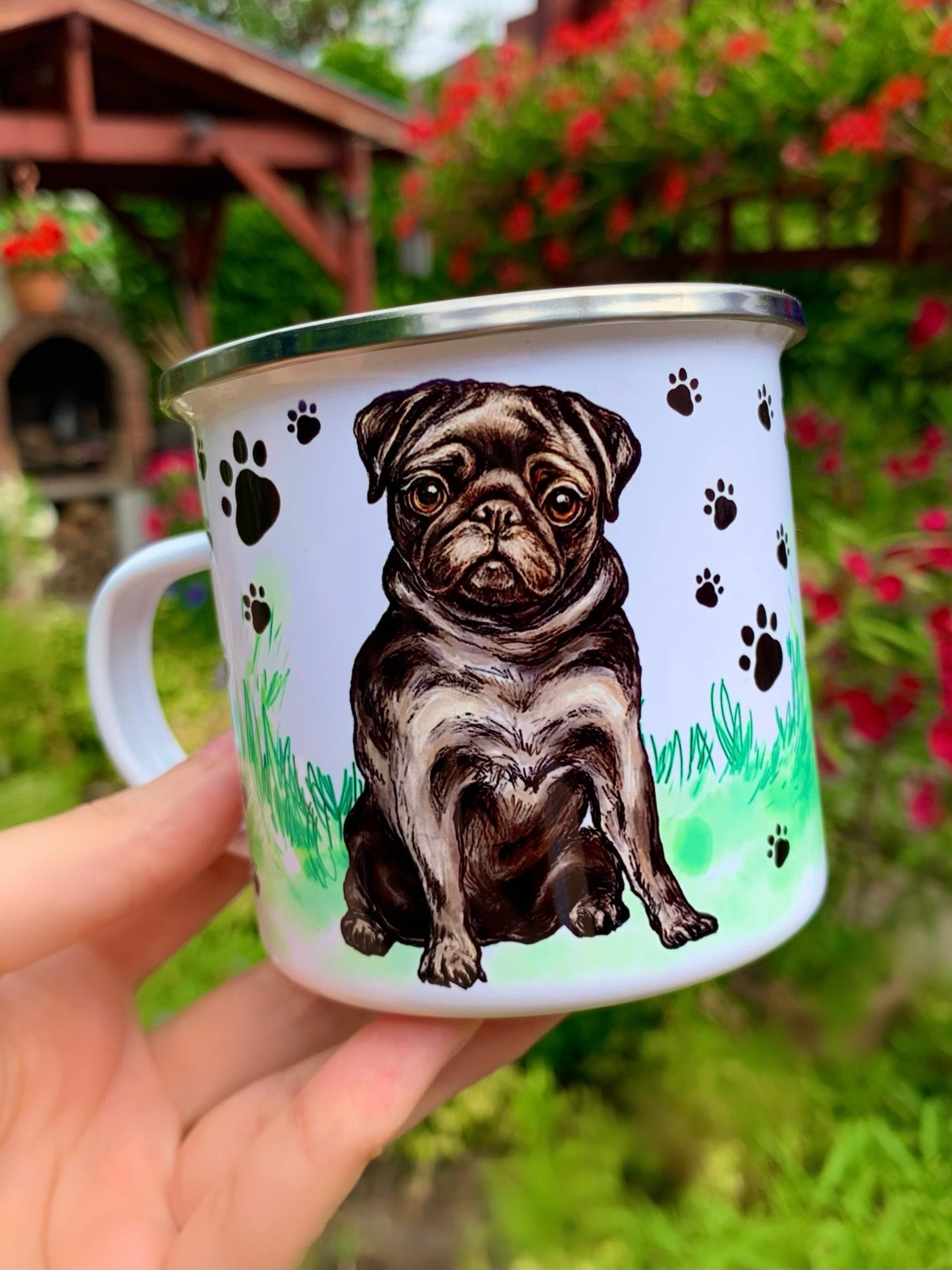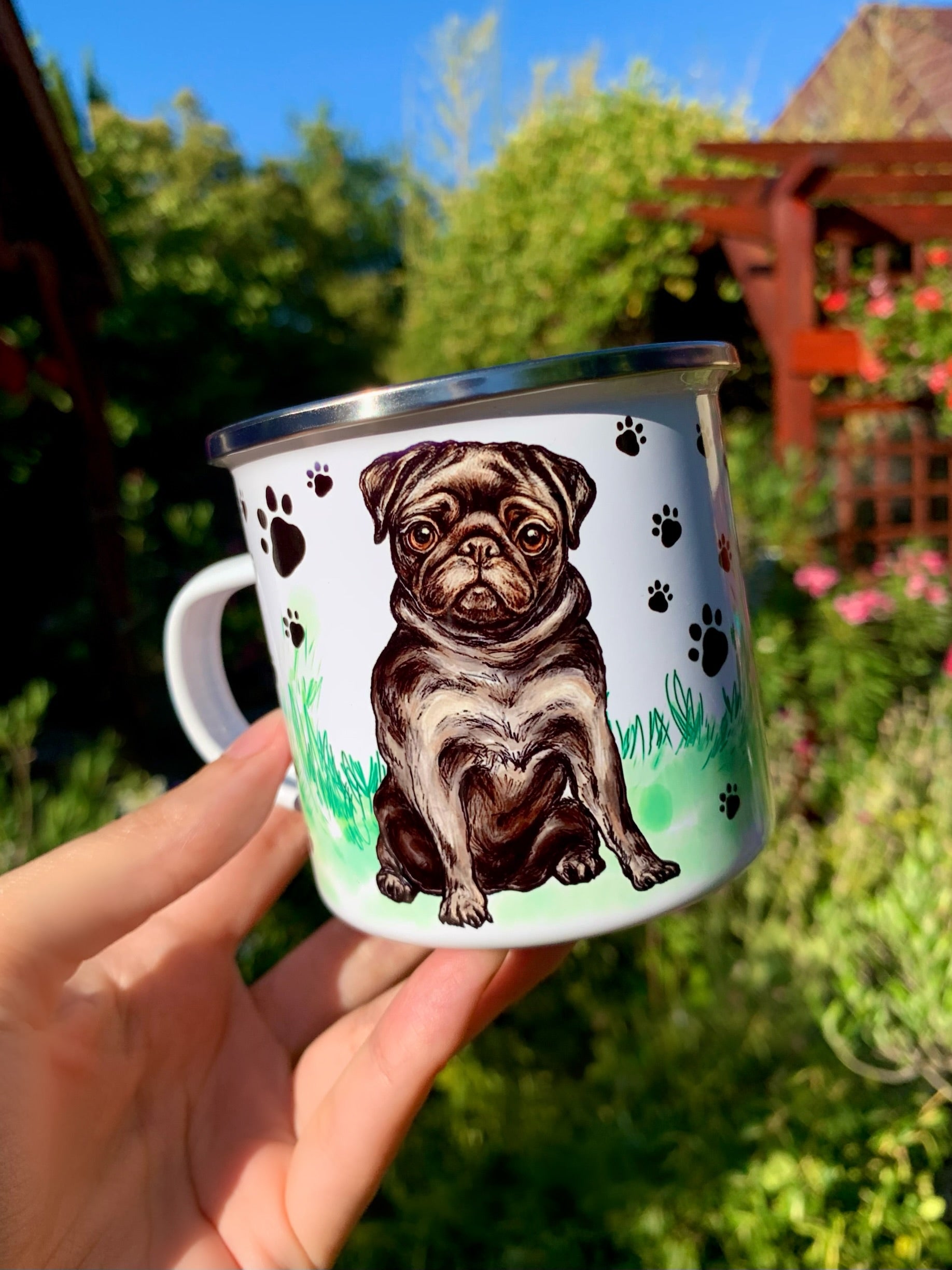 💕 Ne habozz, rendeld meg most ezt az aranyos mopsz mintás fém bögrét, és tedd még különlegesebbé a kávészünetet!
