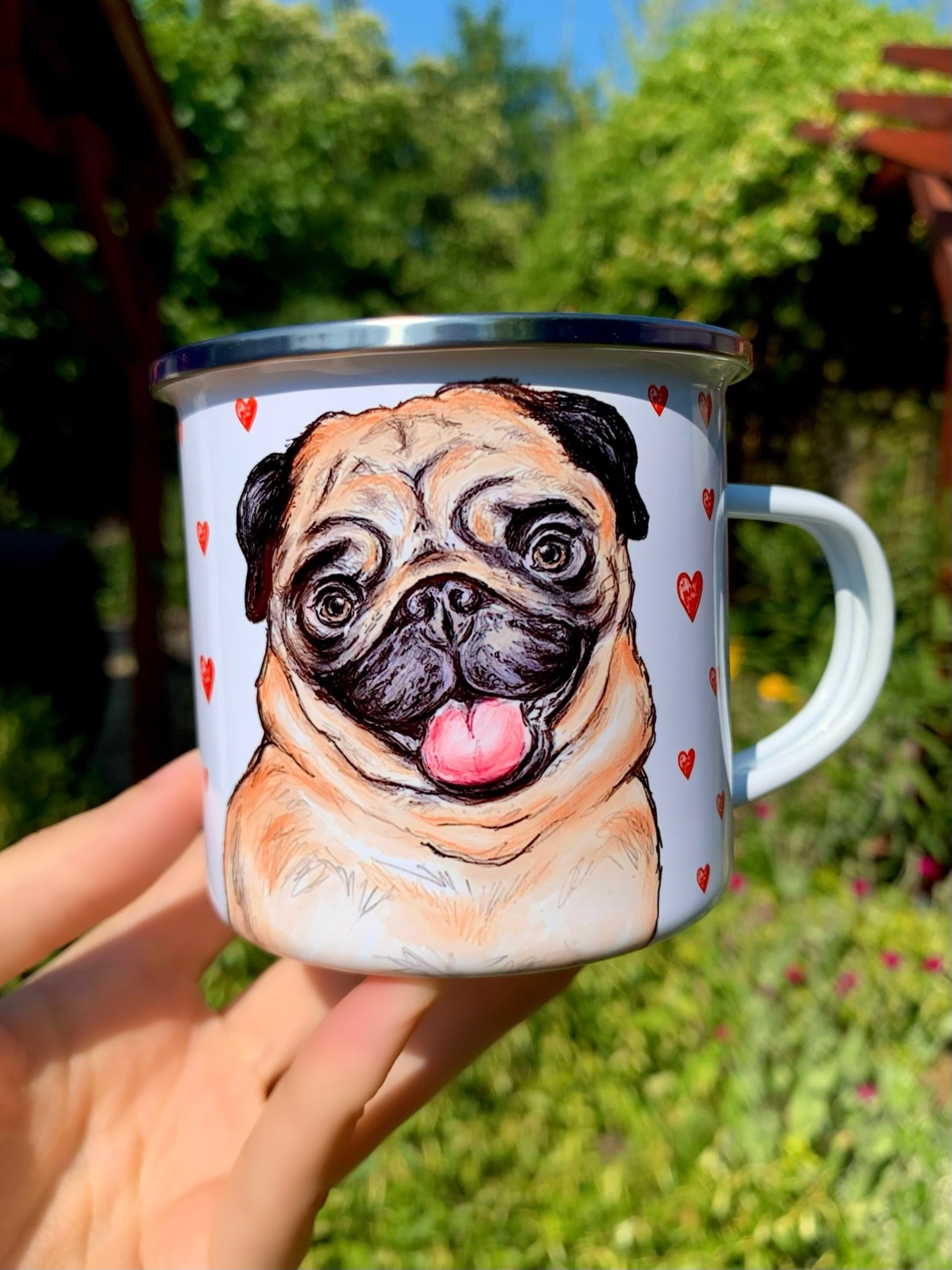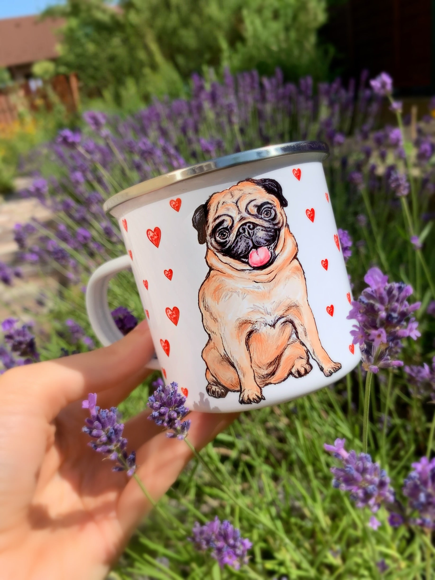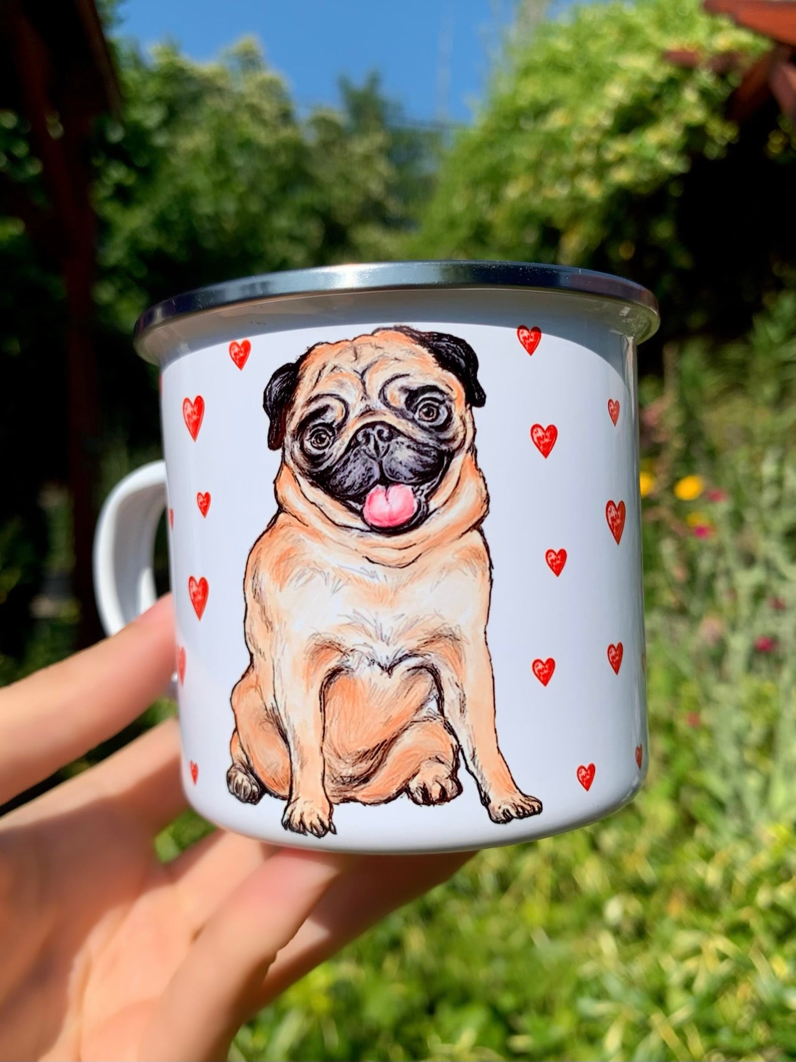 💕 Ne habozz, rendeld meg most ezt az aranyos mopsz mintás fém bögrét, és tedd még különlegesebbé a kávészünetet!