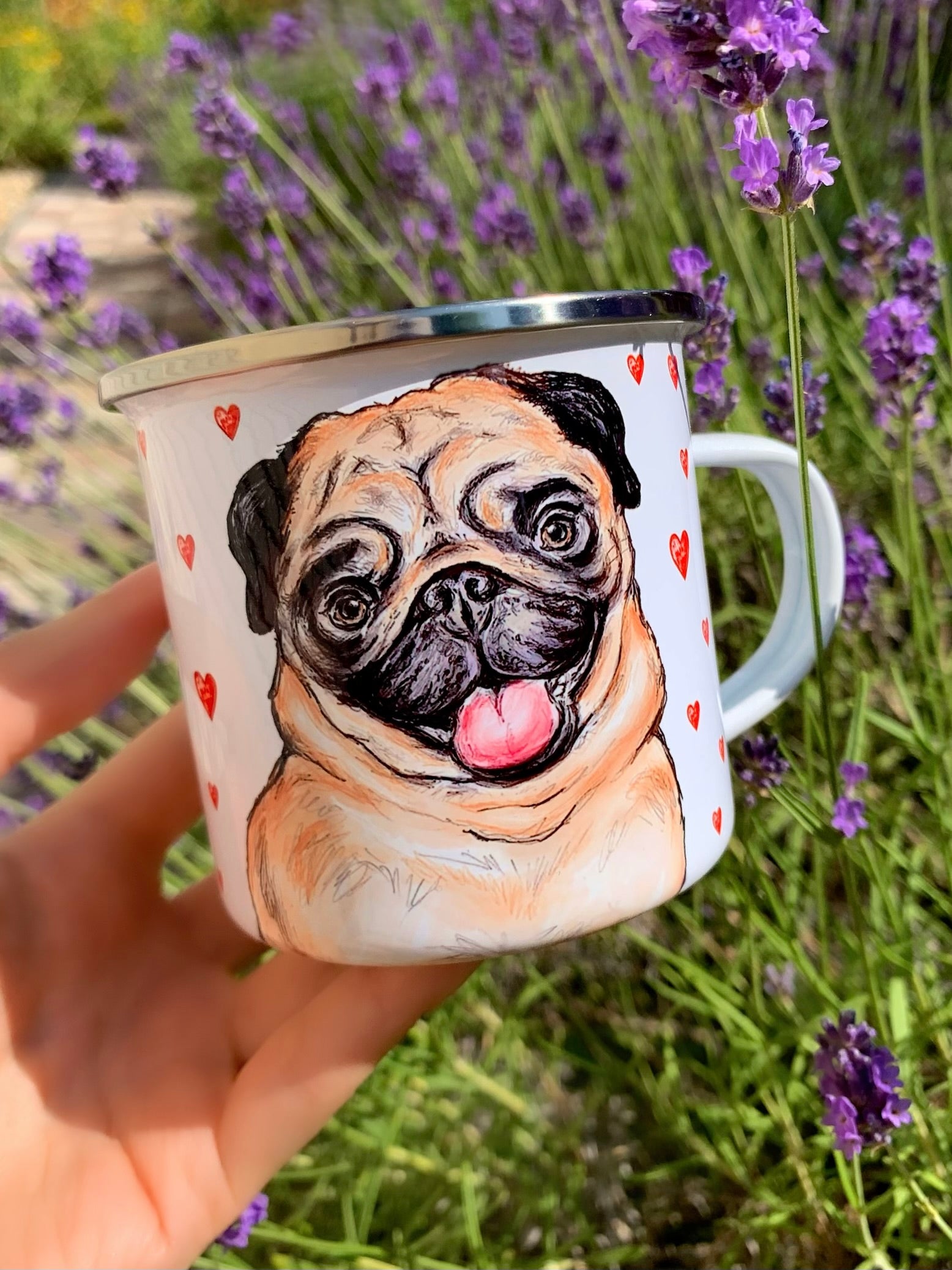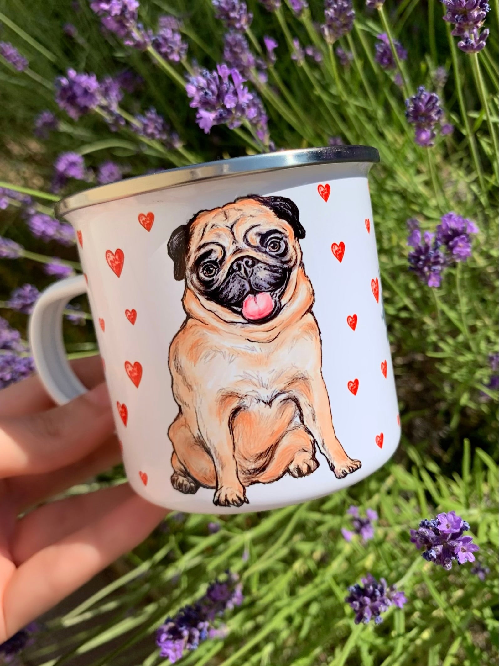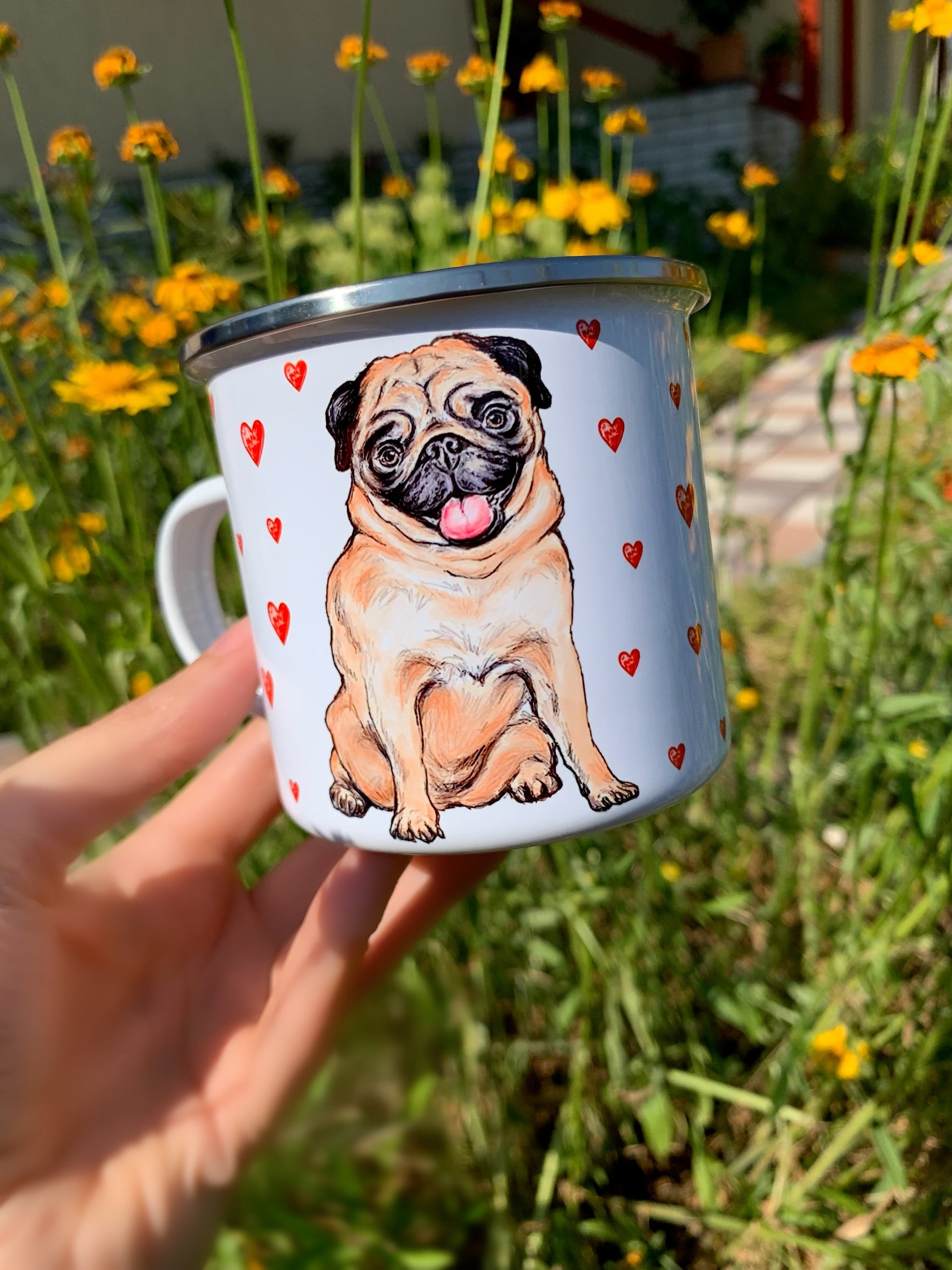 💕 Ne habozz, rendeld meg most ezt az aranyos mopsz mintás fém bögrét, és tedd még különlegesebbé a kávészünetet!