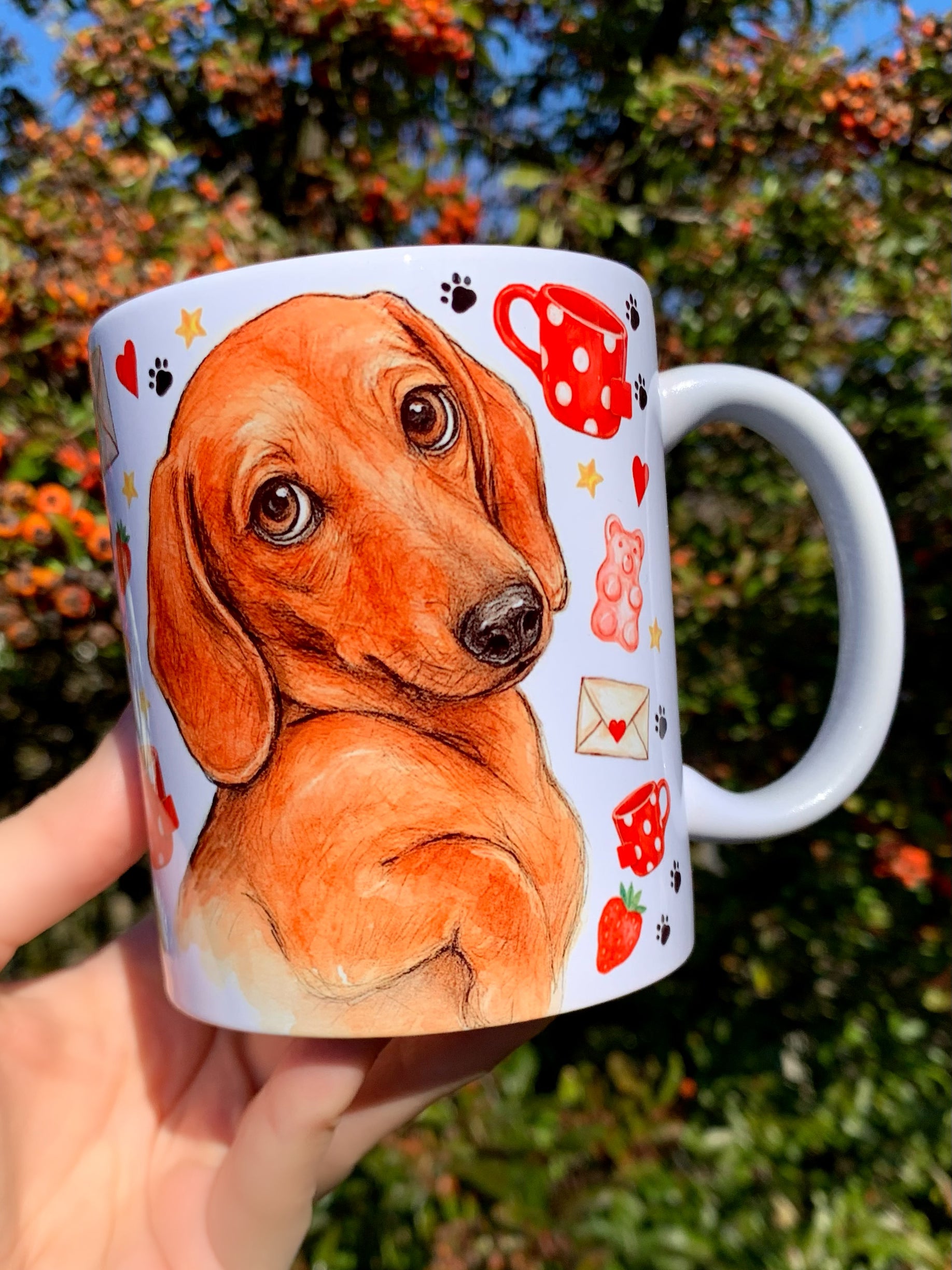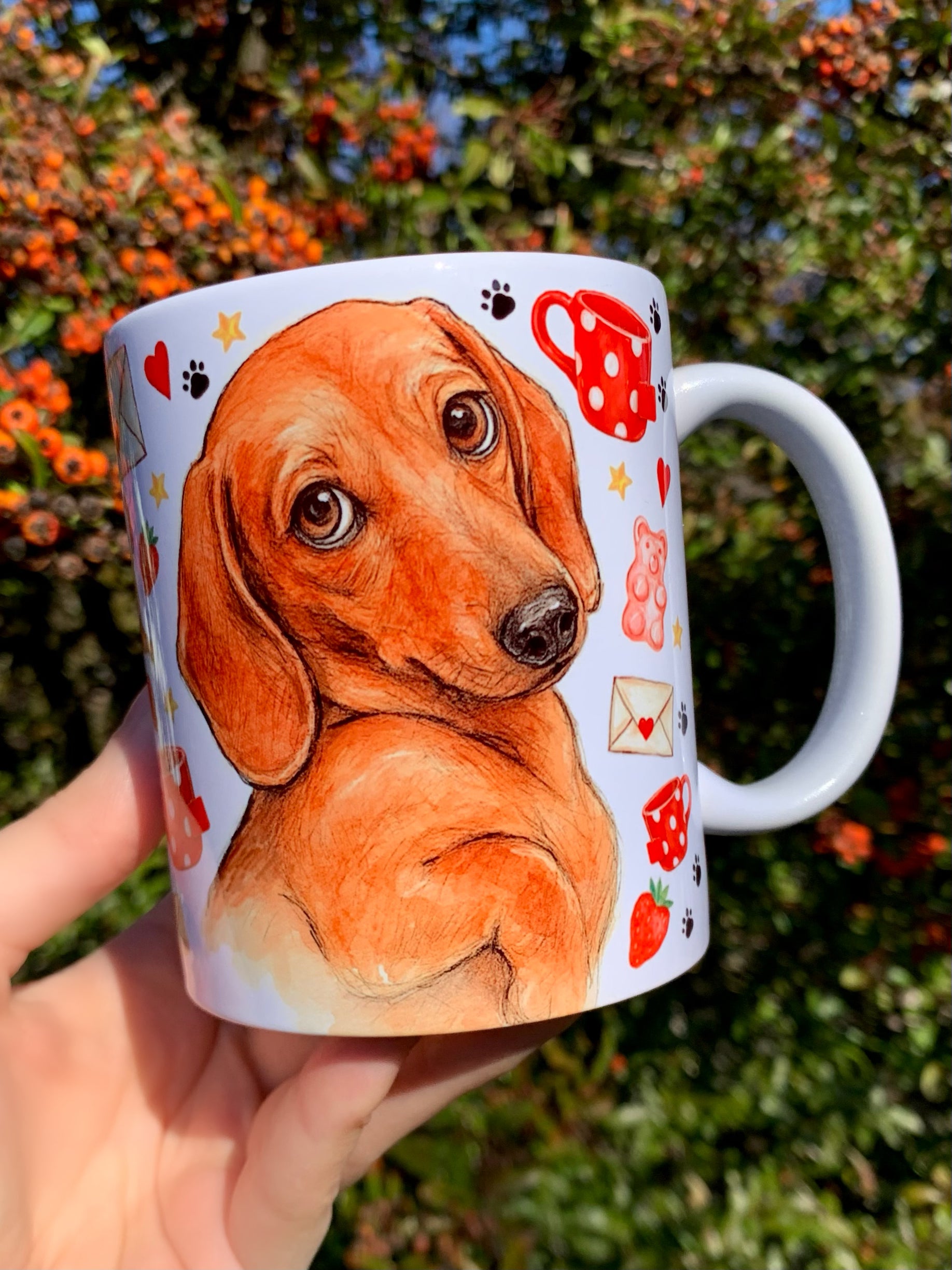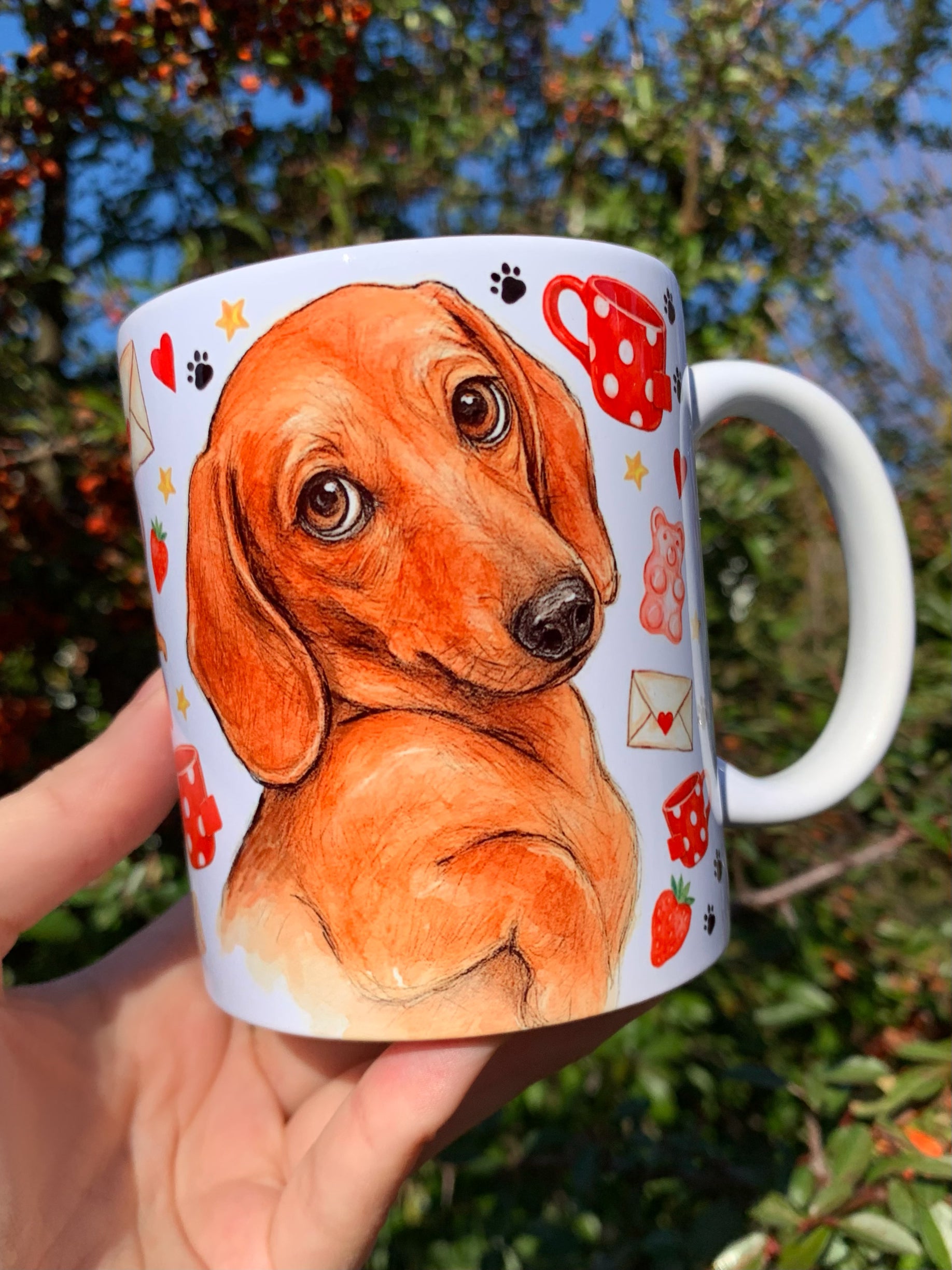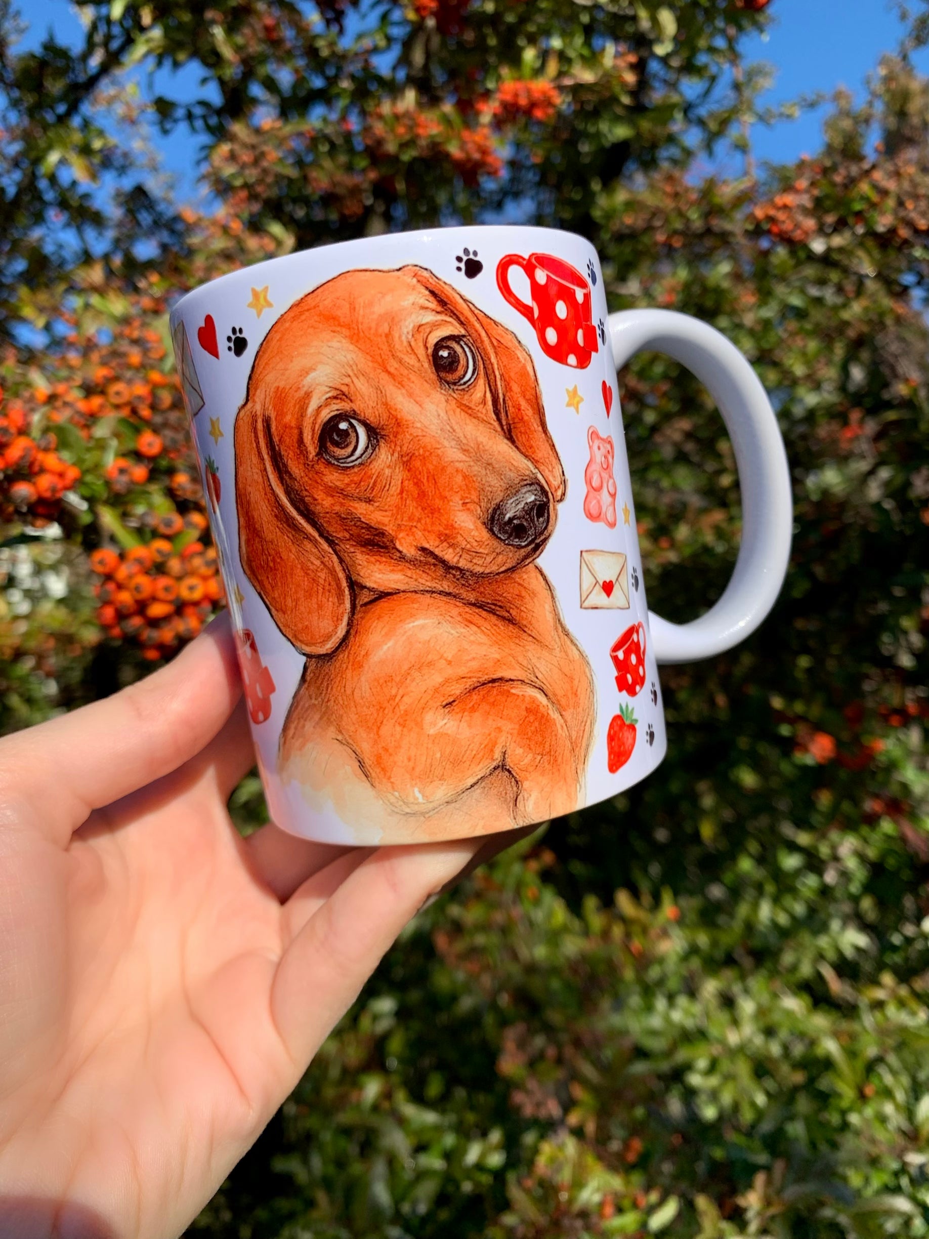 🎨 A bögrén látható tacskó grafikát Pusztai Judit iparművész eredetileg kézzel rajzolta és festette kifejezetten a márkánk számára.
