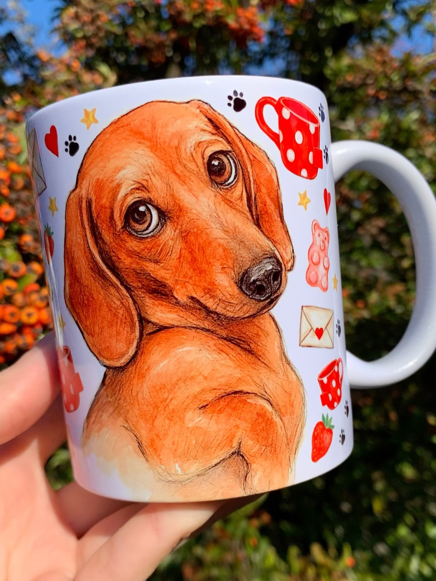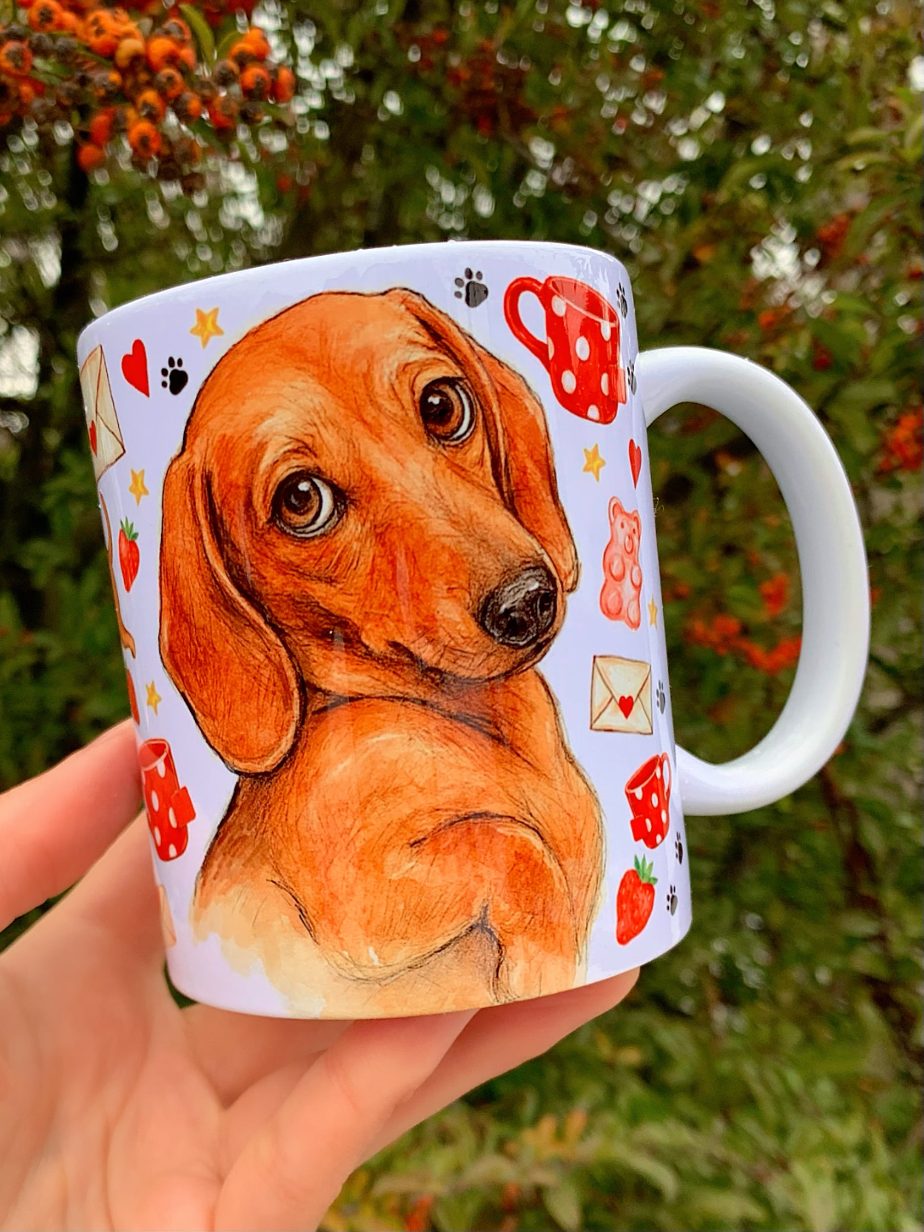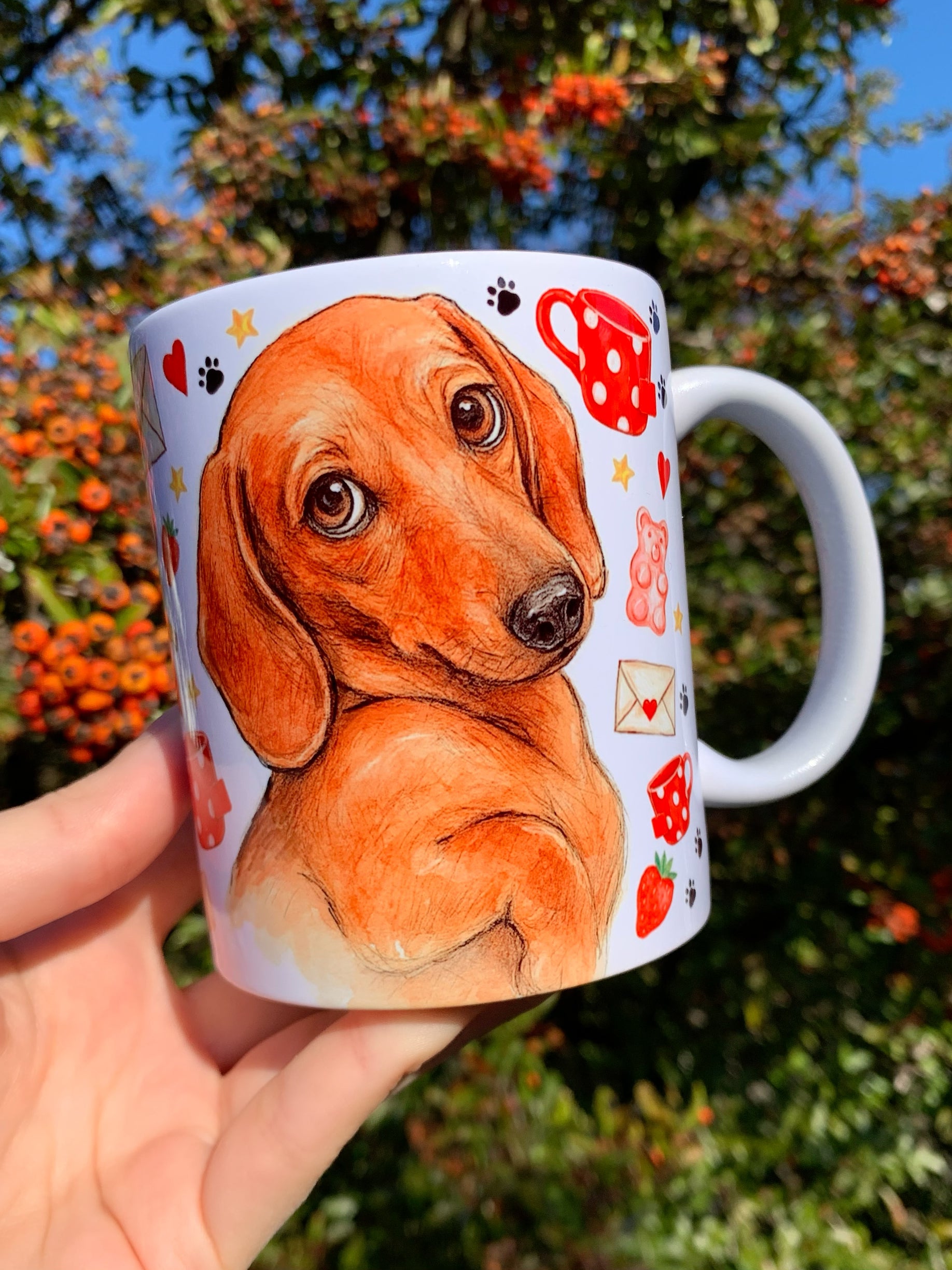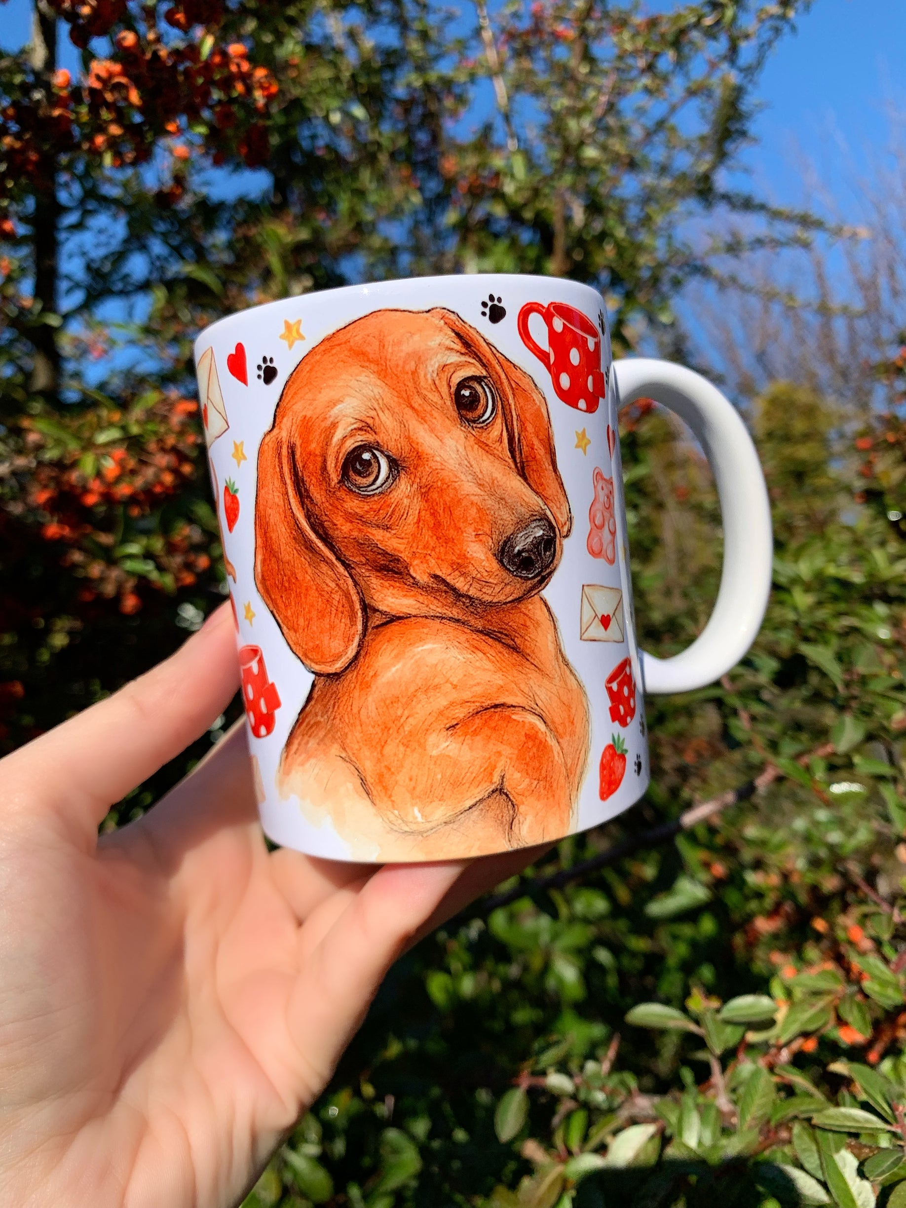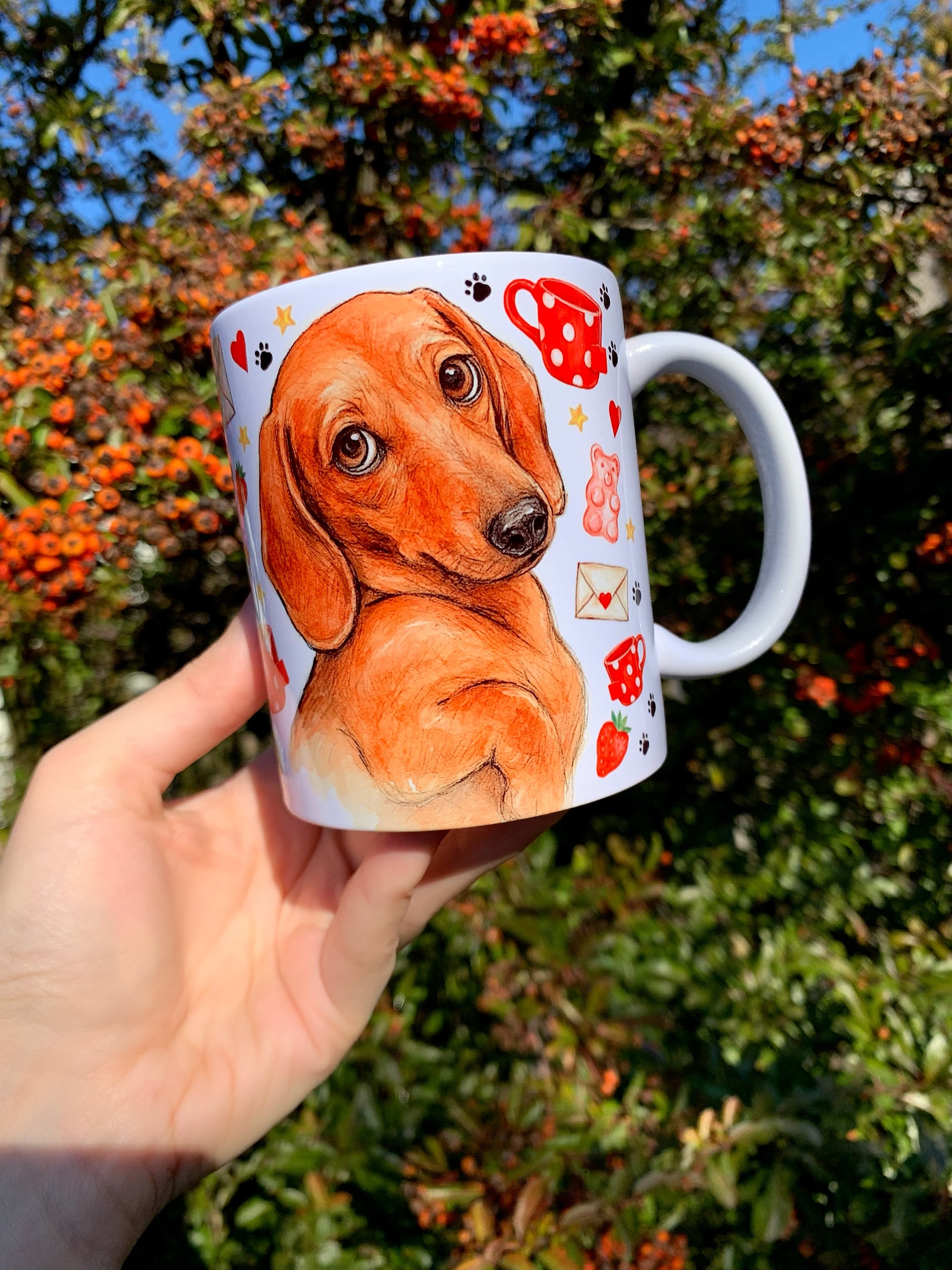 🎨 A bögrén látható tacskó grafikát Pusztai Judit iparművész eredetileg kézzel rajzolta és festette kifejezetten a márkánk számára.