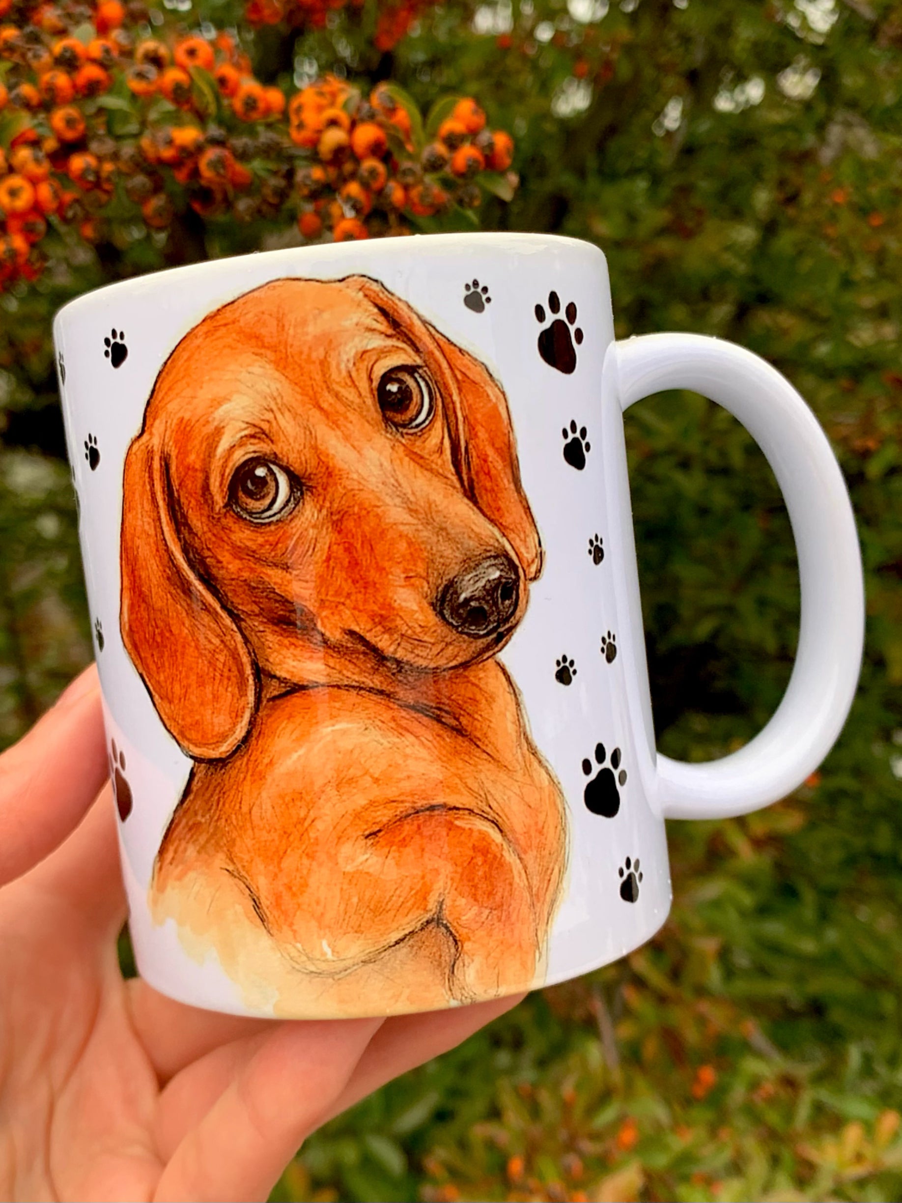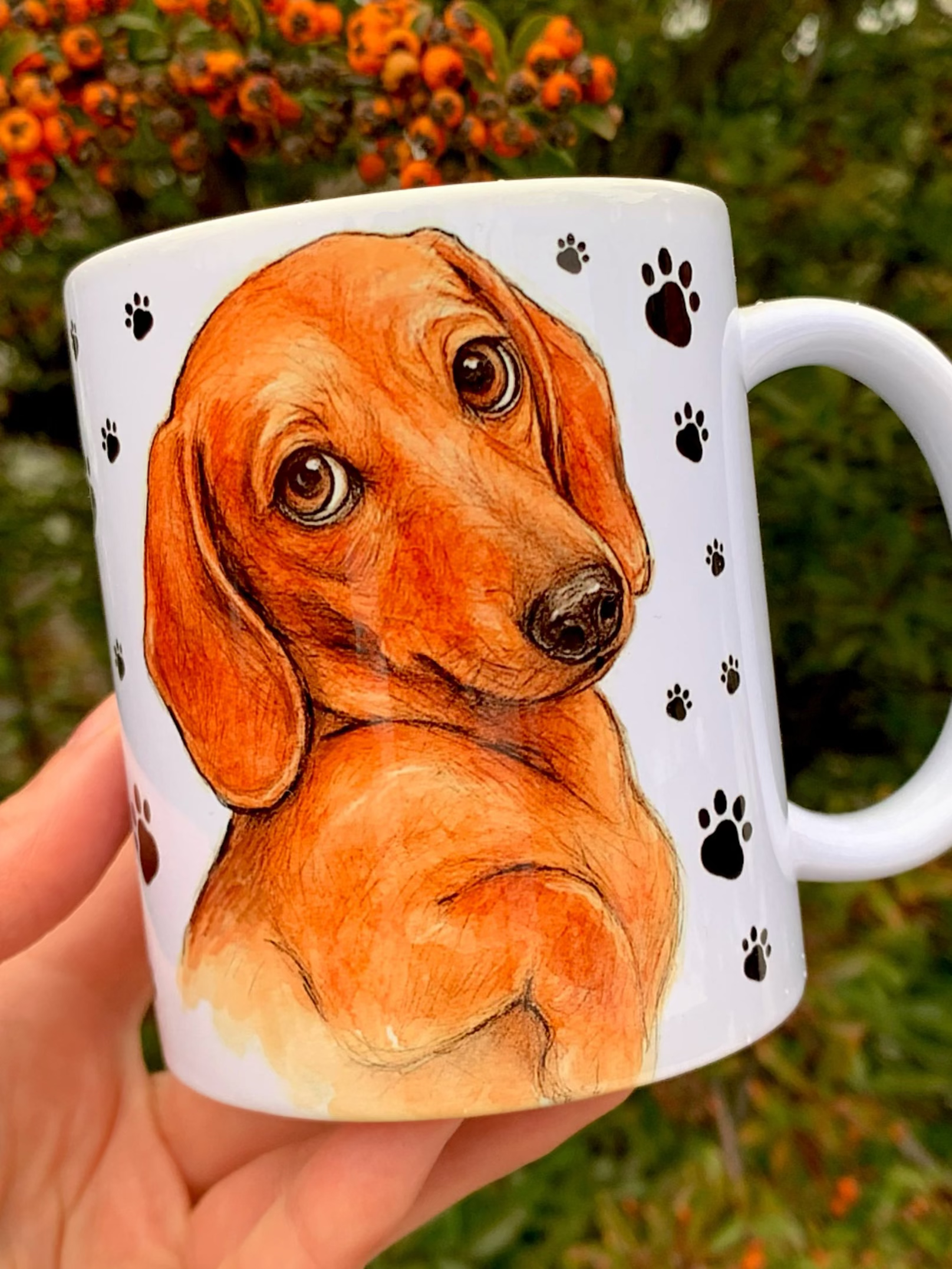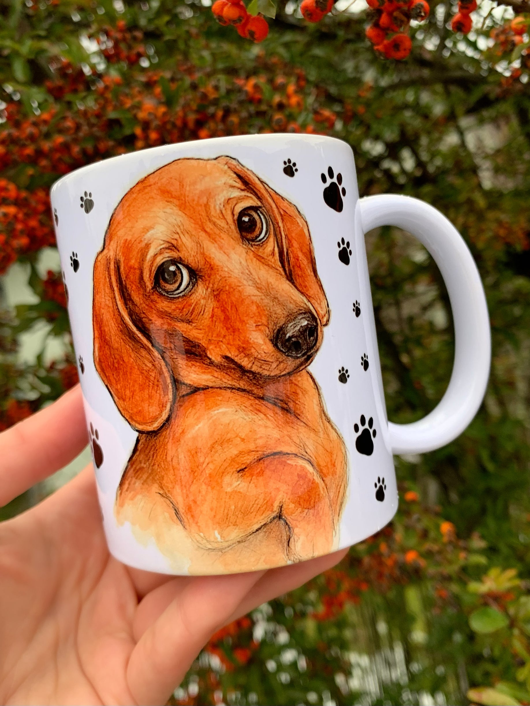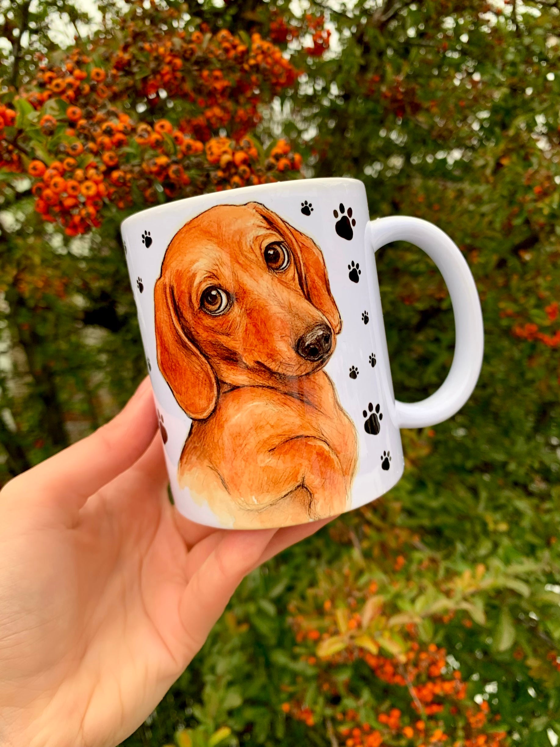 🎨 A bögrén látható tacskó grafikát Pusztai Judit iparművész eredetileg kézzel rajzolta és festette kifejezetten a márkánk számára.