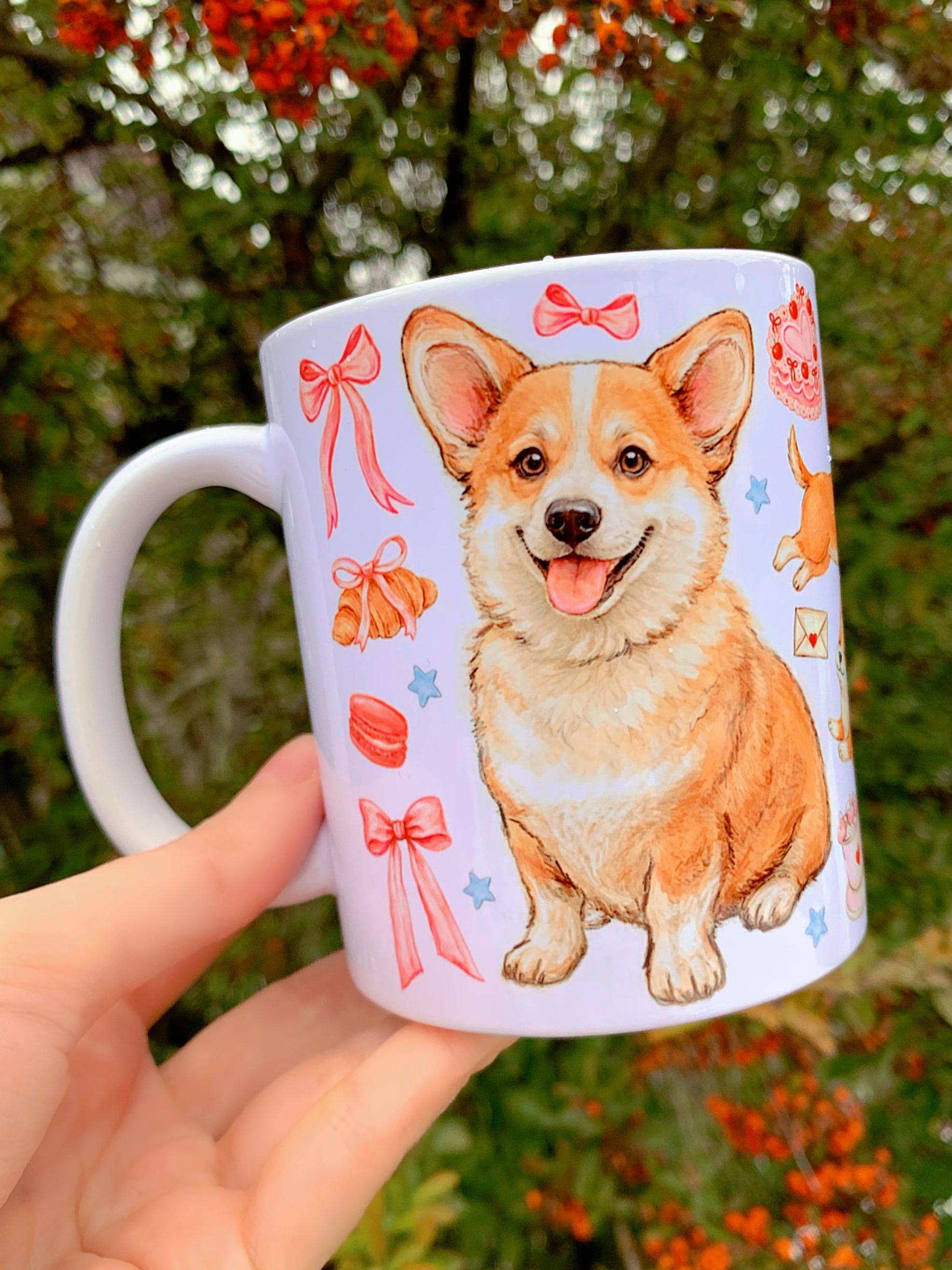 Prémium Corgi kutyás bögre - Kézzel festett Corgi kutya és süteményes masnis mintával